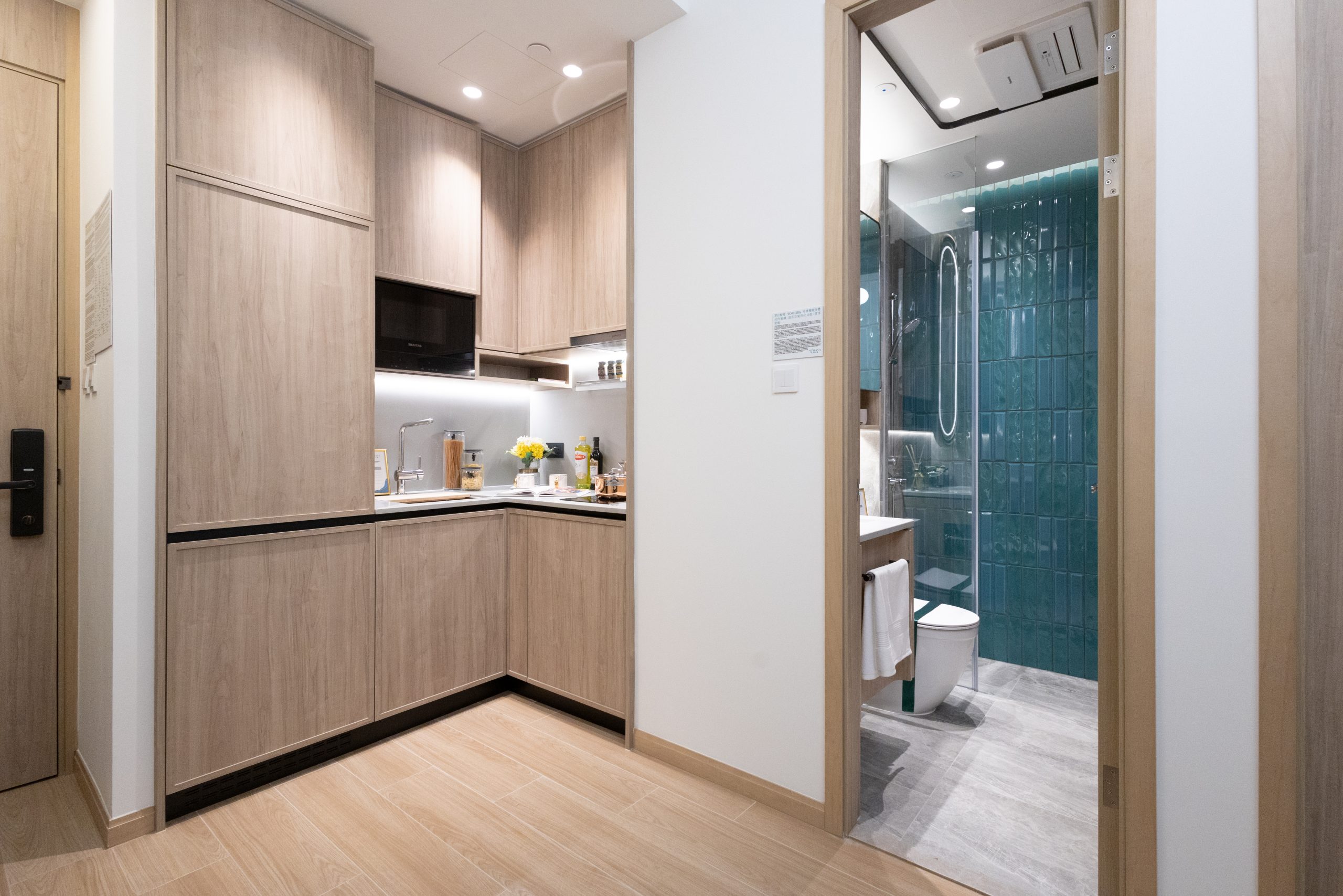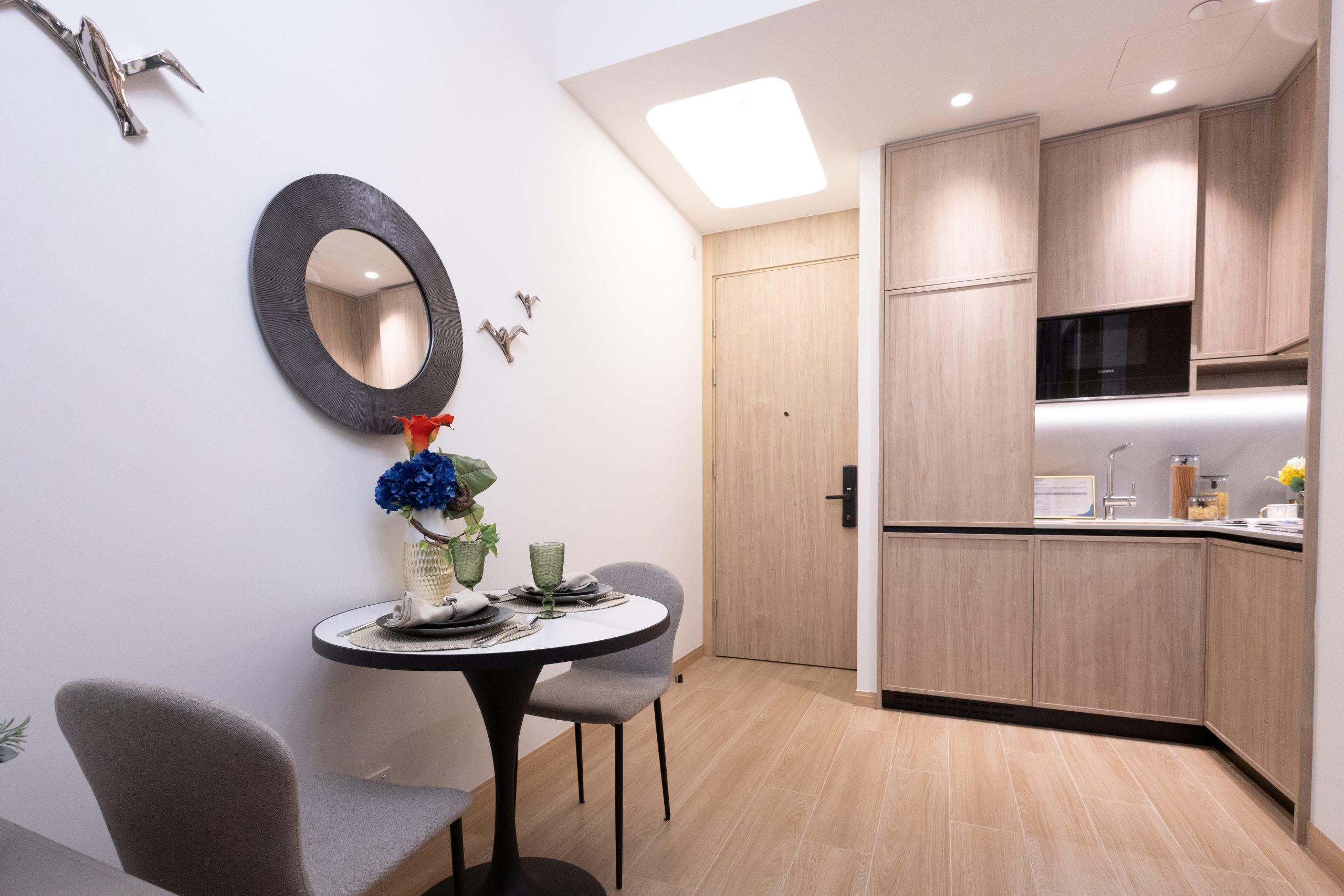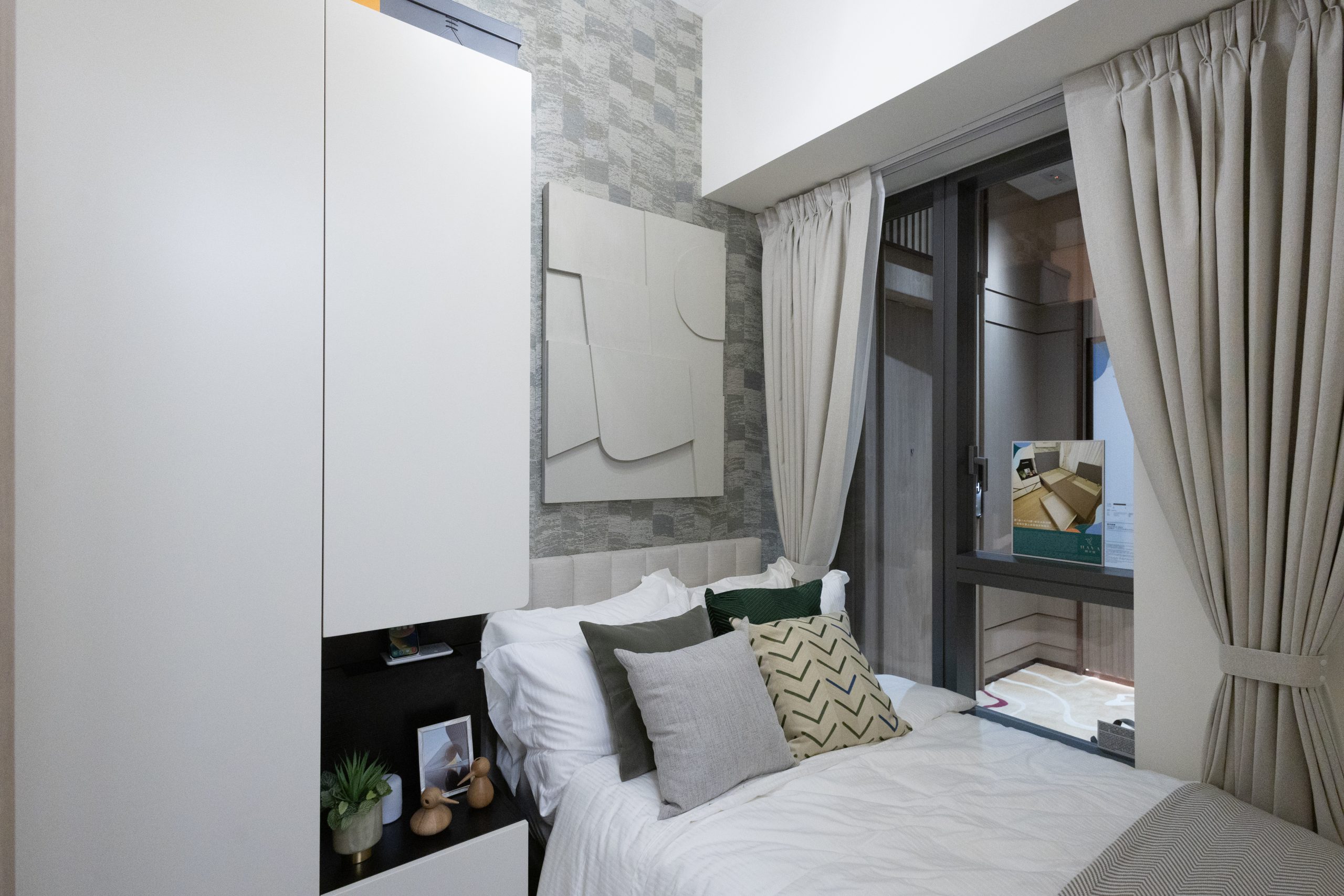 另外,這個系列配備多功能的家具,如可轉變形狀的角几和梳化床,實用性十足,配合室內特高樓底的特高約2.4米衣櫃,為項目度身訂造。特寬床底儲物空間,配備油壓裝置,輕鬆收納。