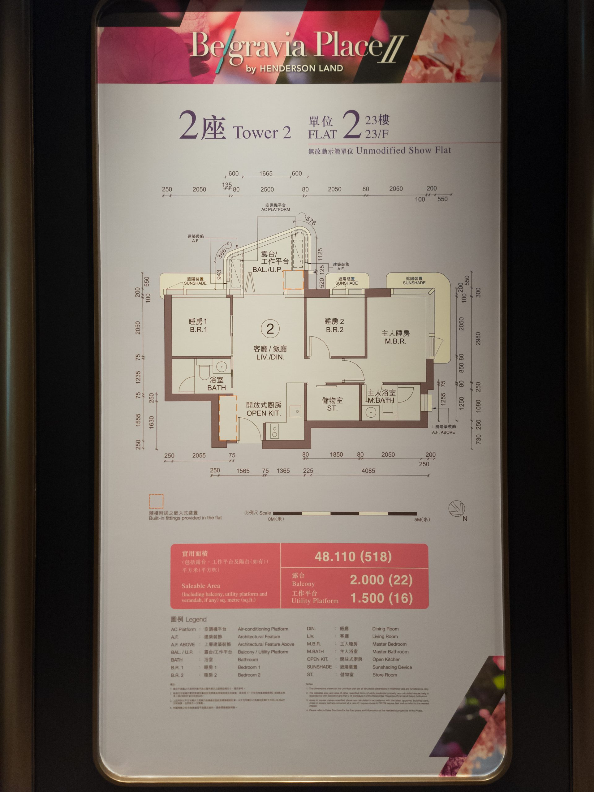 以第2座23樓單位2為藍本打造的三房一套連儲物室示範單位,實用面積518方呎,項目第2期中只佔23伙。單位間隔寬敞,擁有層與層之間高度約3.5米優勢,開則吋吋實用,長方形客飯廳配合L型開放式廚房設計,長約5米,闊約2.5米,間隔設計分明,輕鬆擺放各式家具,寬闊的空間為使用和可塑性創造更多可能。
