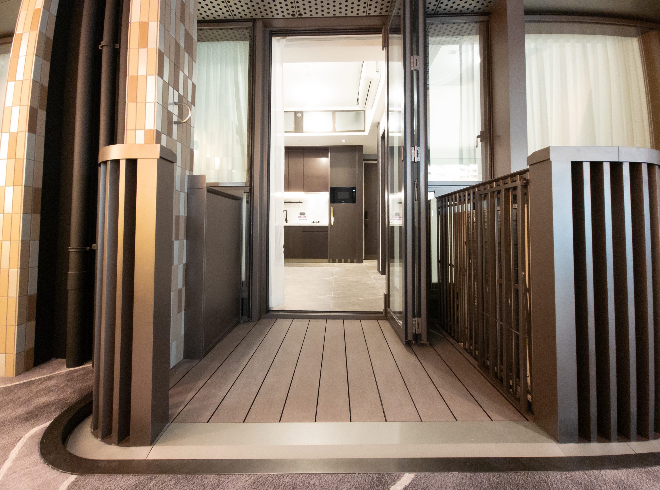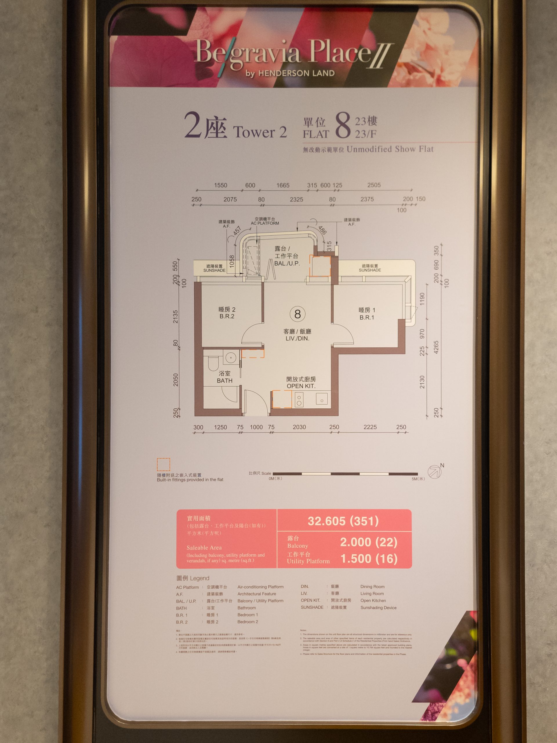 以第2座23樓單位8為藍本打造的兩房示範單位,實用面積351方呎,天花設儲物空間。層與層之間高度約3.5米,單位開則方正實用,客廳及飯廳以長方形佈局,可靈活擺放傢俬;玄關位特設嵌入式鞋櫃及置物架,增加收納空間,貼心照顧住戶所需;單位38方呎的『三合一』露台配落地玻璃趟摺門設計,倍添靈活度,亦省卻空間,由長方形客飯廳至露台長達約5.5米,充份延伸視覺空間之餘,更令整體空間開闊明亮;同時,客飯廳與『三合一』露台的方向,正好與兩邊的睡房落地玻璃幕牆方向一致,氣勢十足,景觀開揚,而且廣納自然光線,採光十足。
