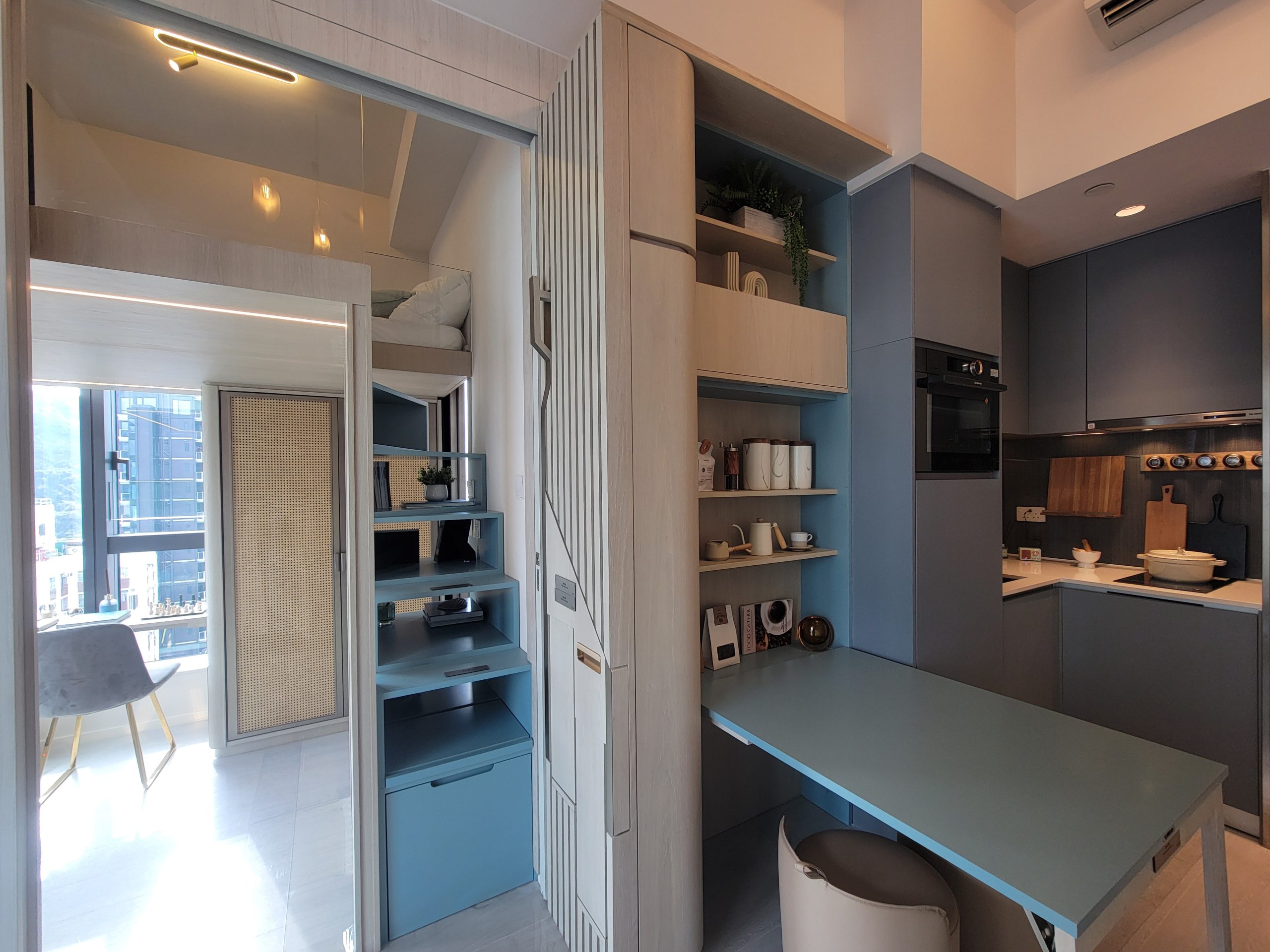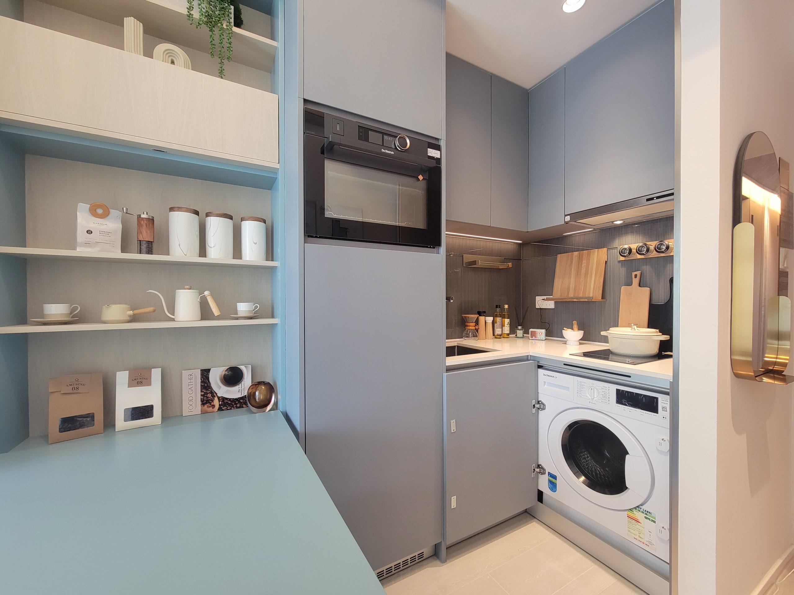 開放式廚房配備法國廚房電器品牌De Dietrich全套設備,包括雙頭電磁爐、蒸焗爐、抽油煙機、雪櫃及洗衣乾衣機。廚房的櫥櫃採用淺藍色,轉角位置採用折合式櫃門,節省每一寸儲物空間。客廳設有隱藏式側反餐檯,可以當工作檯使用,餐檯可輕鬆折疊釋放出更多空間。空調系統選用了日本Daikin品牌的變頻冷暖分體式空調機,節能環保有效過濾及阻隔PM2.5。