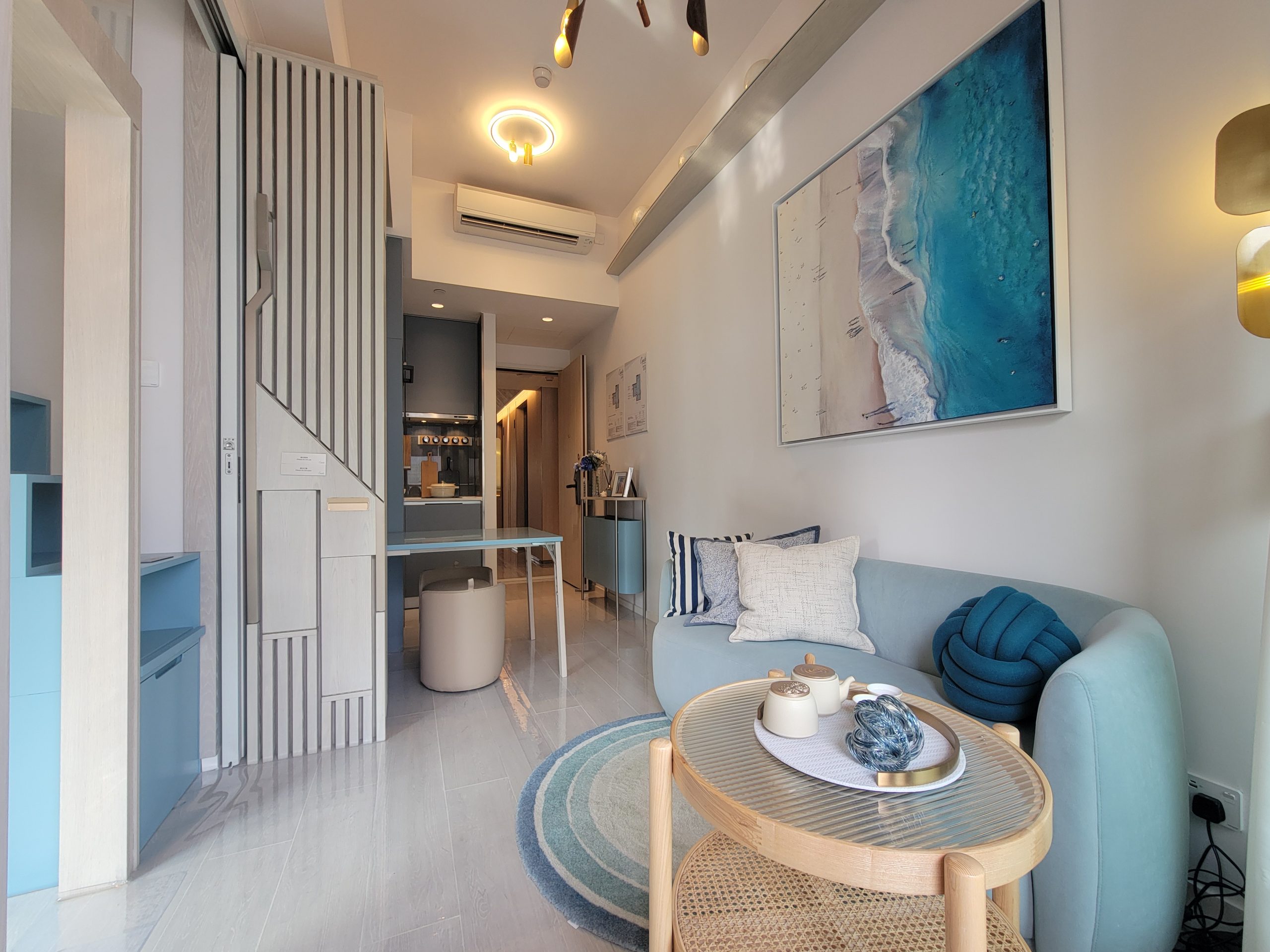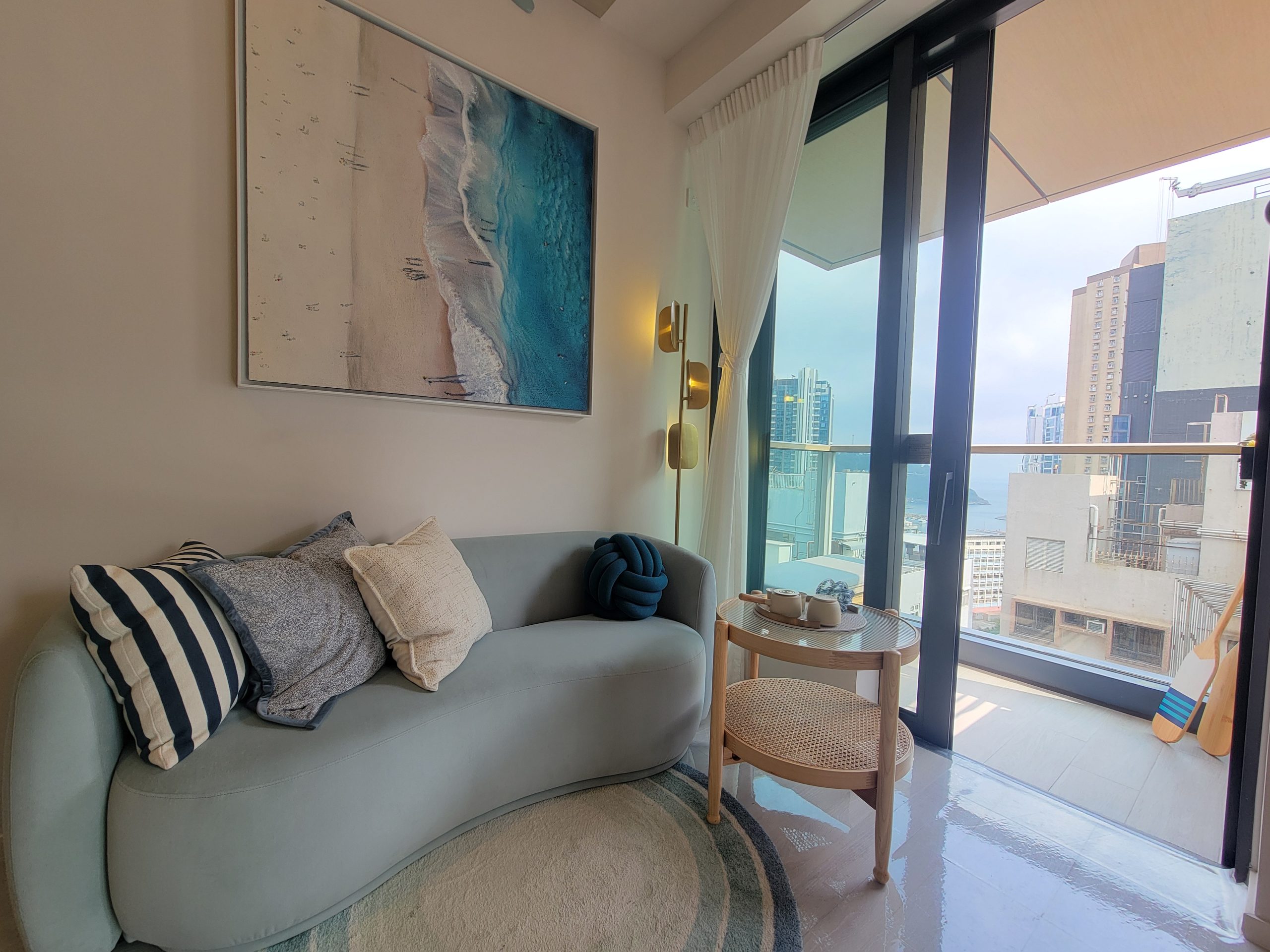 單位享有開揚城市景,遠眺海洋公園以及深灣遊艇會景緻,地板以淺色木紋磚貫通客廳、浴室及開放式廚房,搭配木色及淺藍色的傢俱和櫥櫃,營造出如同海邊小屋般和諧舒適的氛圍。客廳的電視牆以簡約的木飾面牆為背景,淺藍色布藝梳化與整體裝潢相得益彰,牆上懸掛著設計師精心挑選的海灘畫作,為空間增添濃厚的海岸風情。