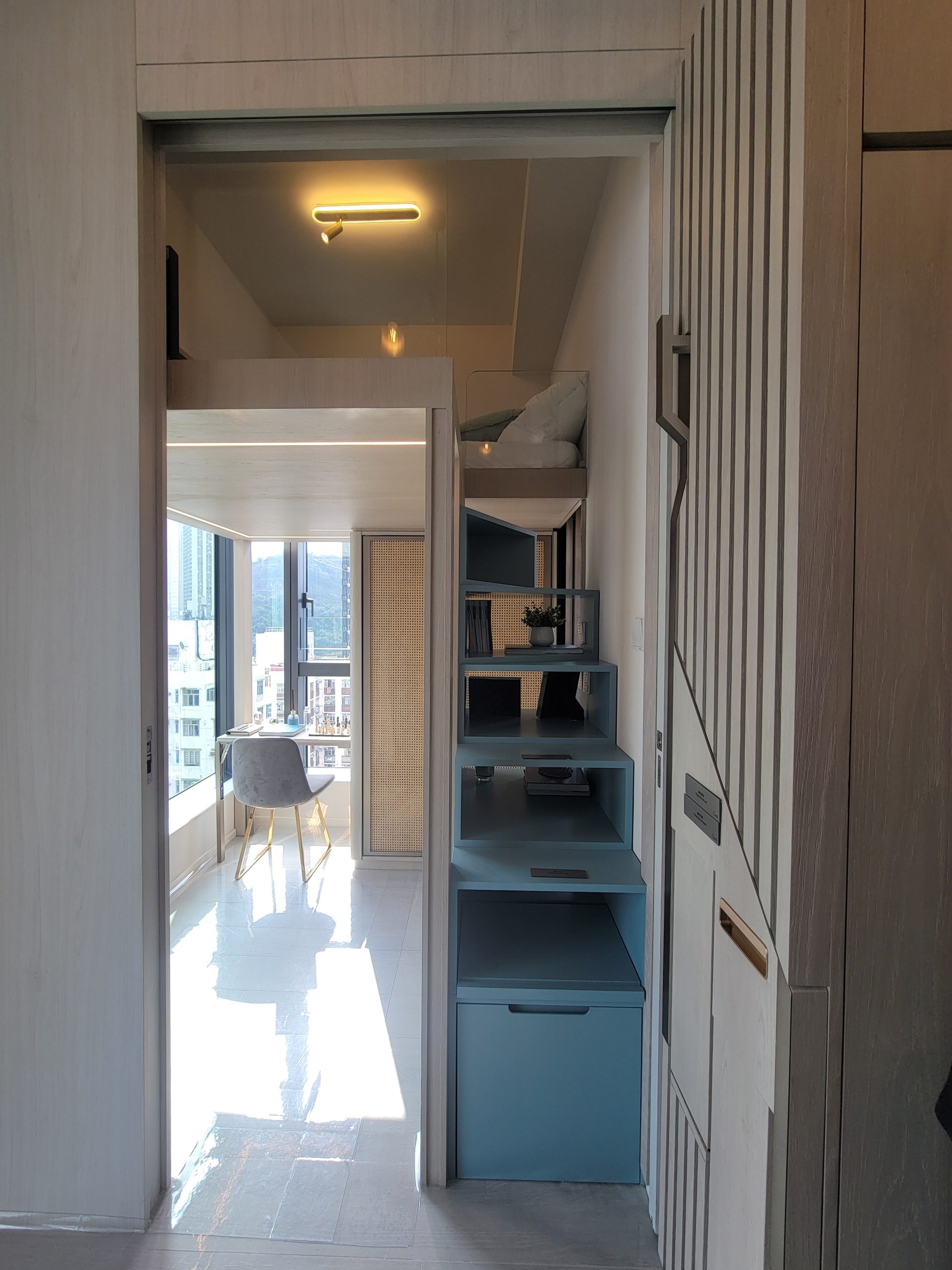 主人睡房拉開木板趟門後可連接睡房與客廳空間,增添通透感。主人睡房訂製了一體化組合的高架床的設計有效劃活動空間,上層睡眠區擺放著一張舒適的雙人大床。下層配備雙門衣櫃,衣櫃側設有隱藏式側反書檯,方便住戶日常工作或梳妝。訂製的儲物樓梯用盡收納空間,部分梯級亦可以收起。主人睡房特別設計了寬敞的轉角玻璃窗,讓自然光線充分滲透,同時可270度全方位欣賞開揚景觀。大面積的落地玻璃選用了高效能的雙層中空玻璃(IGU)配低幅射鍍膜及強化玻璃,有效降低熱度及紫外線輻射,實現卓越的節能效果。