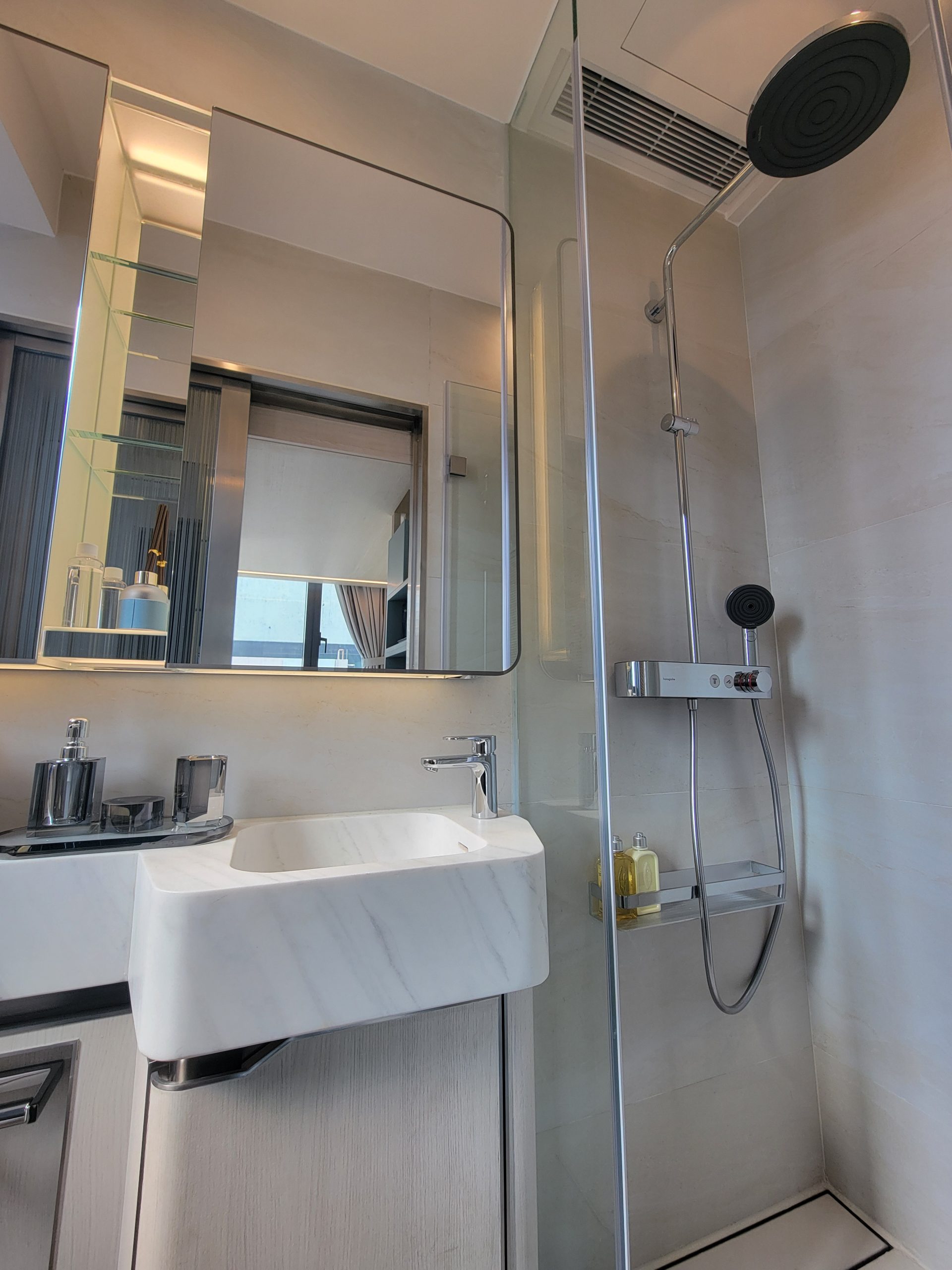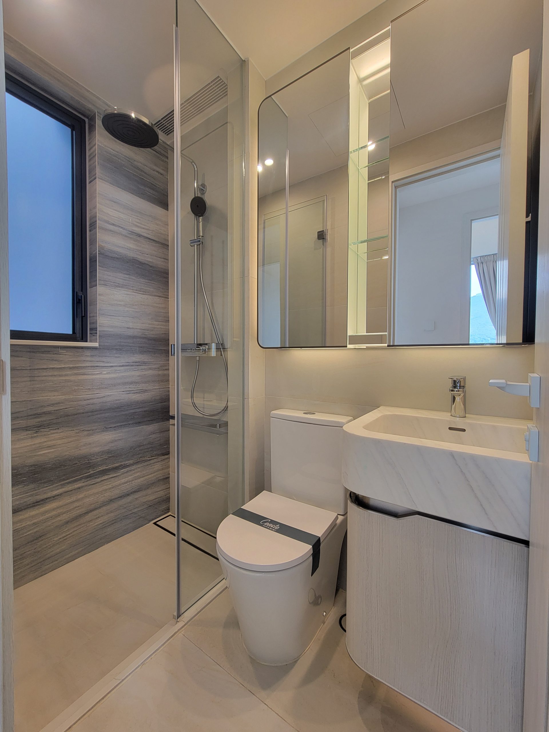 浴室為明廁設計,設有窗戶增加通風,淋浴區域配備了德國衛浴品牌Hansgrohe的時尚雨淋式花灑和多功能水龍頭套裝,搭配Stiebel Eltron即熱式電熱水爐。灰藍色石紋理磚增添視覺美感,推拉門設計的淋浴間有效節省空間,並增加靈活性。鏡櫃巧妙增加了置物空間,方便擺放日用品,充分滿足了收納需求及電器存放的功能。