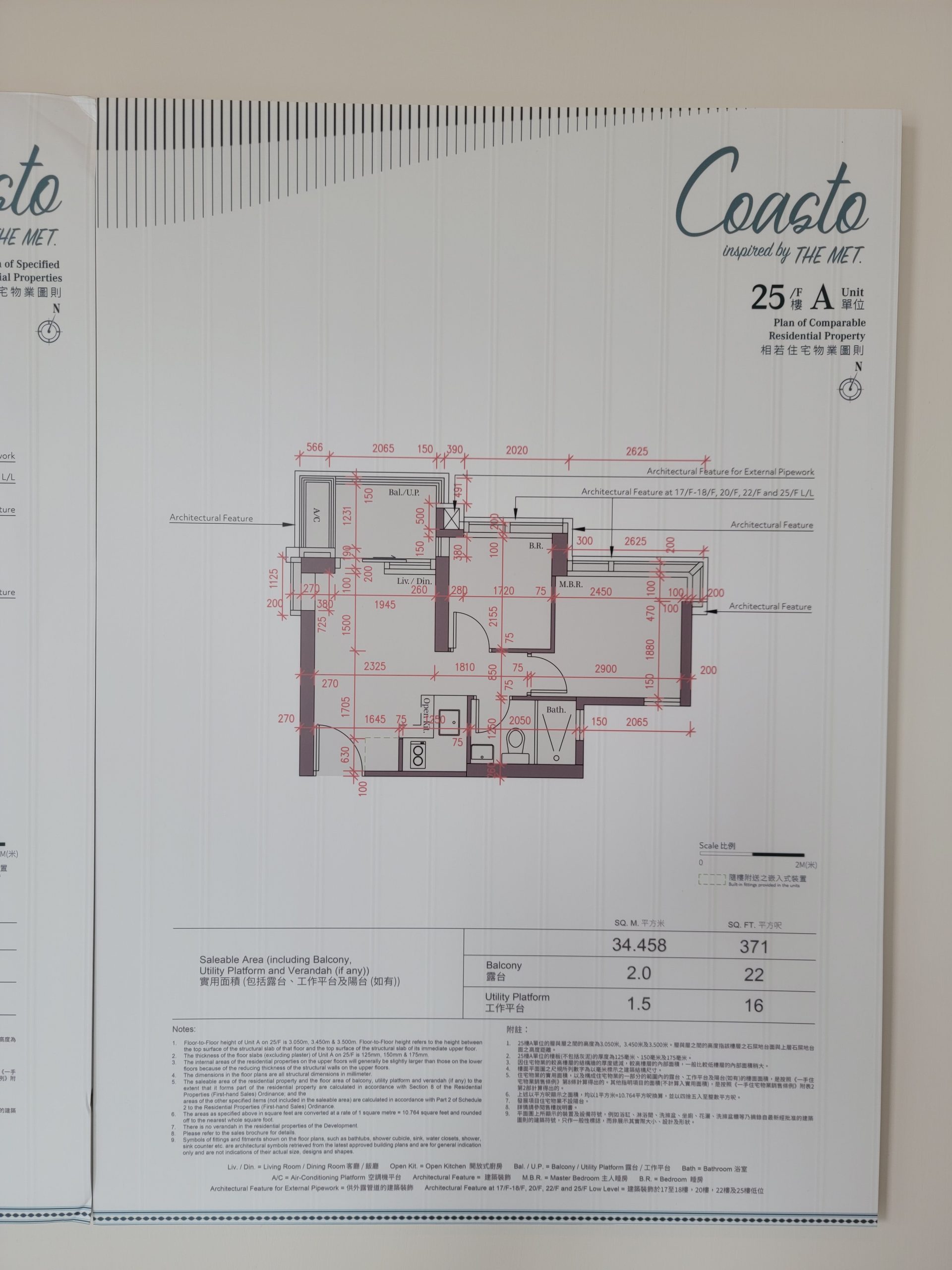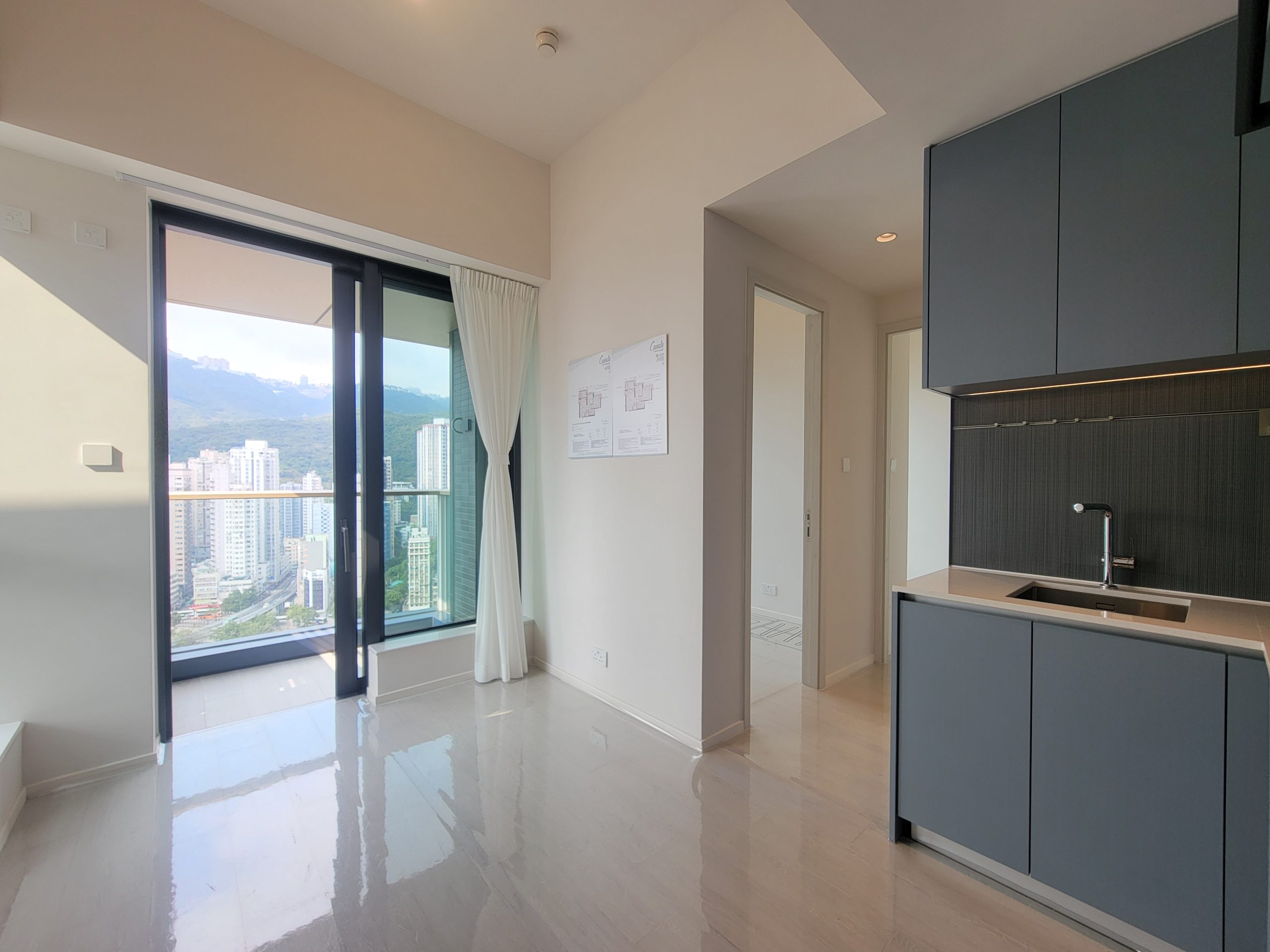 25樓A室,為兩房開放式廚房間隔,實用面積371方呎,層與層之間的高度約3.5米。單位室內設計概念以「天、海、沙」為主,以淡藍色、白色及木色調貫通,打造悠然生活感。