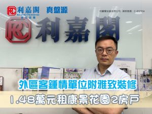 利嘉閣地產康怡區助理營業董事丁培鴻(Sam)稱,栢蕙苑分行高級客戶董事黃俊雄(Edmond)日前促成鰂魚涌康景花園D座低層6室的二手租賃成交個案,單位實用面積約442方呎,採2房間隔,外望內園景。