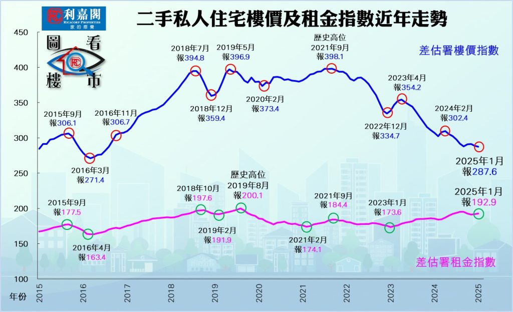 利嘉閣地產研究部主管陳海潮表示,市場好淡因素參半,惟一手新盤持續低價搶灘,令二手樓價維持偏軟;《財政預算案》寬減細價樓印花稅效應料最快3月才能反映。差估署今日公布的最新數據顯示,2025年1月份私人住宅售價指數報287.6點,較去年12月的288.9點再跌0.45%,連跌兩個月,累跌1.30%,並創自2016年9月以來的101個月(即近8年半)新低。若與2021年9月的歷史高位398.1點比較,樓價至今累跌達27.76%。