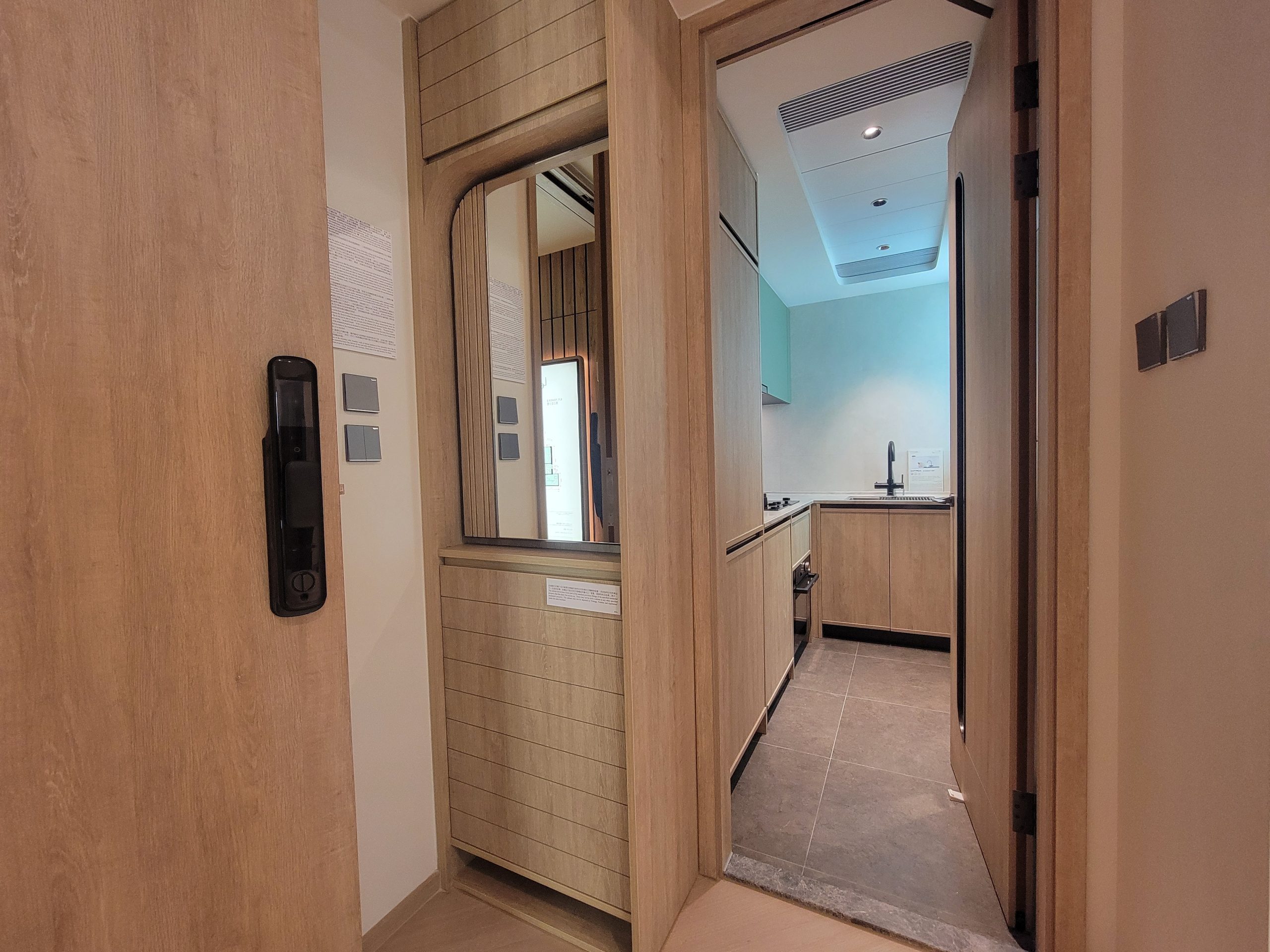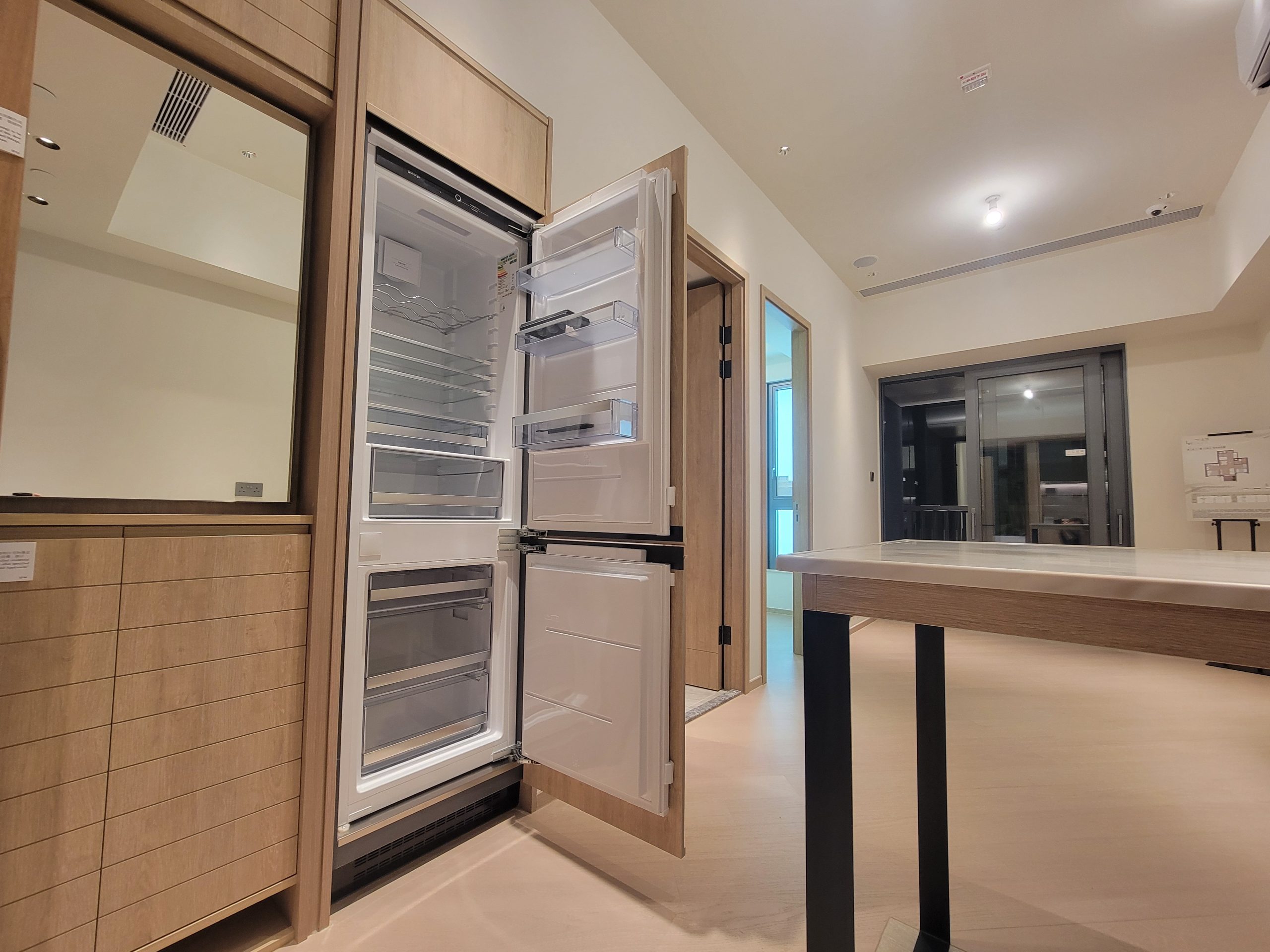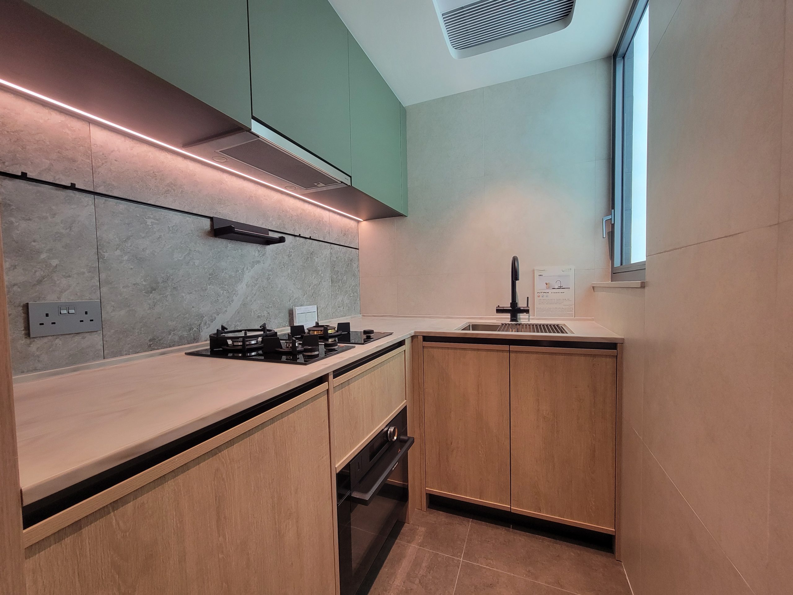 單位內外設計融合,附設的多功能木紋鞋櫃及特色收納鏡櫃,住戶從進門一刻已可感受到大自然氣息,令身心放鬆、回歸恬靜;開放式廚房附有的U型Island Table採用色調淡雅的石紋設計,住戶除可在Island Table享用豐盛美食之外,也可作為工作檯面使用,設計美學及實用性兼容;廚房配備法國皇室御用品牌De Dietrich電磁爐、蒸焗爐、歐洲品牌Gorenje拉趟式抽油煙機及雪櫃及Intrix多功能淨水器連水龍頭。