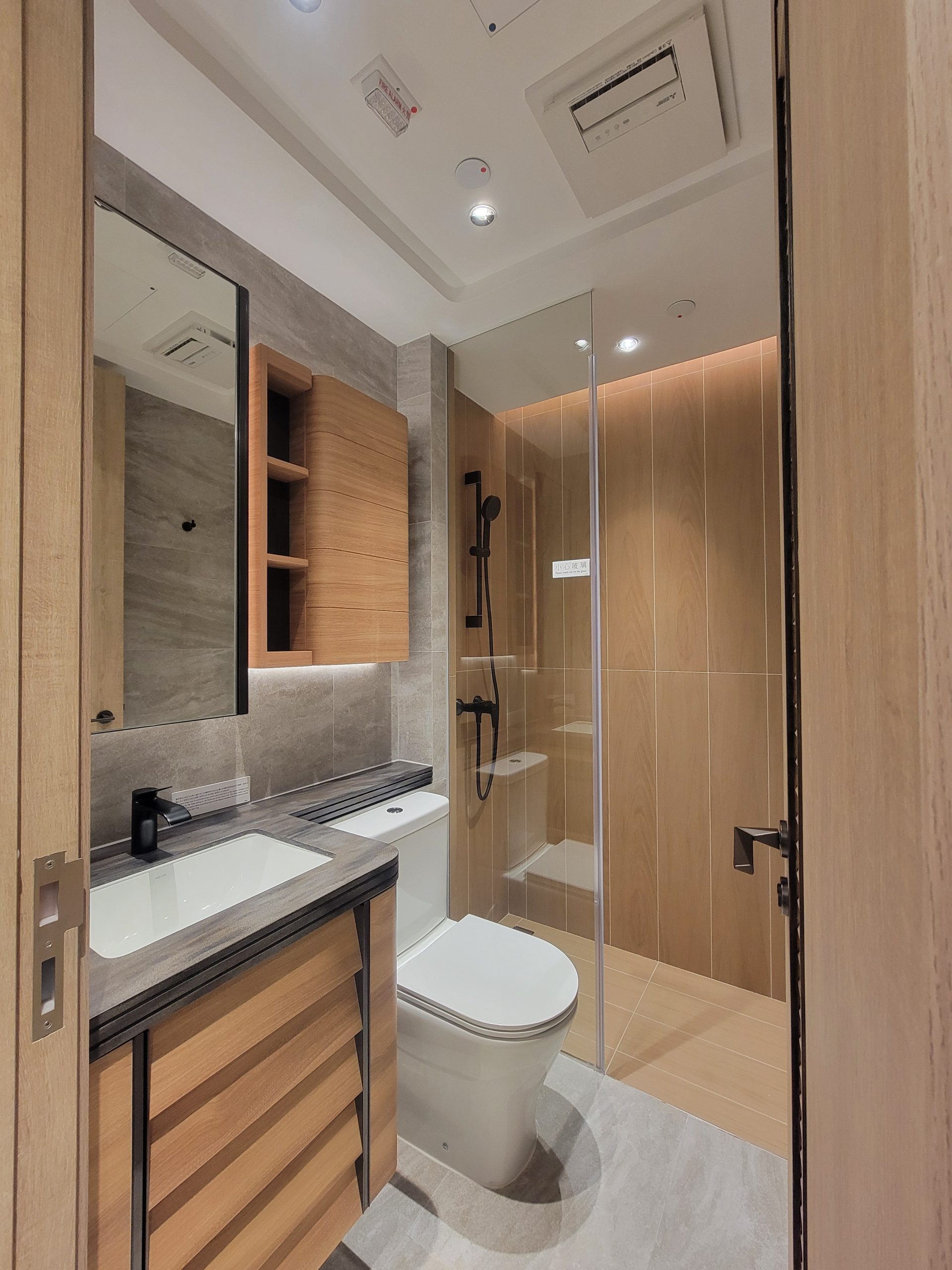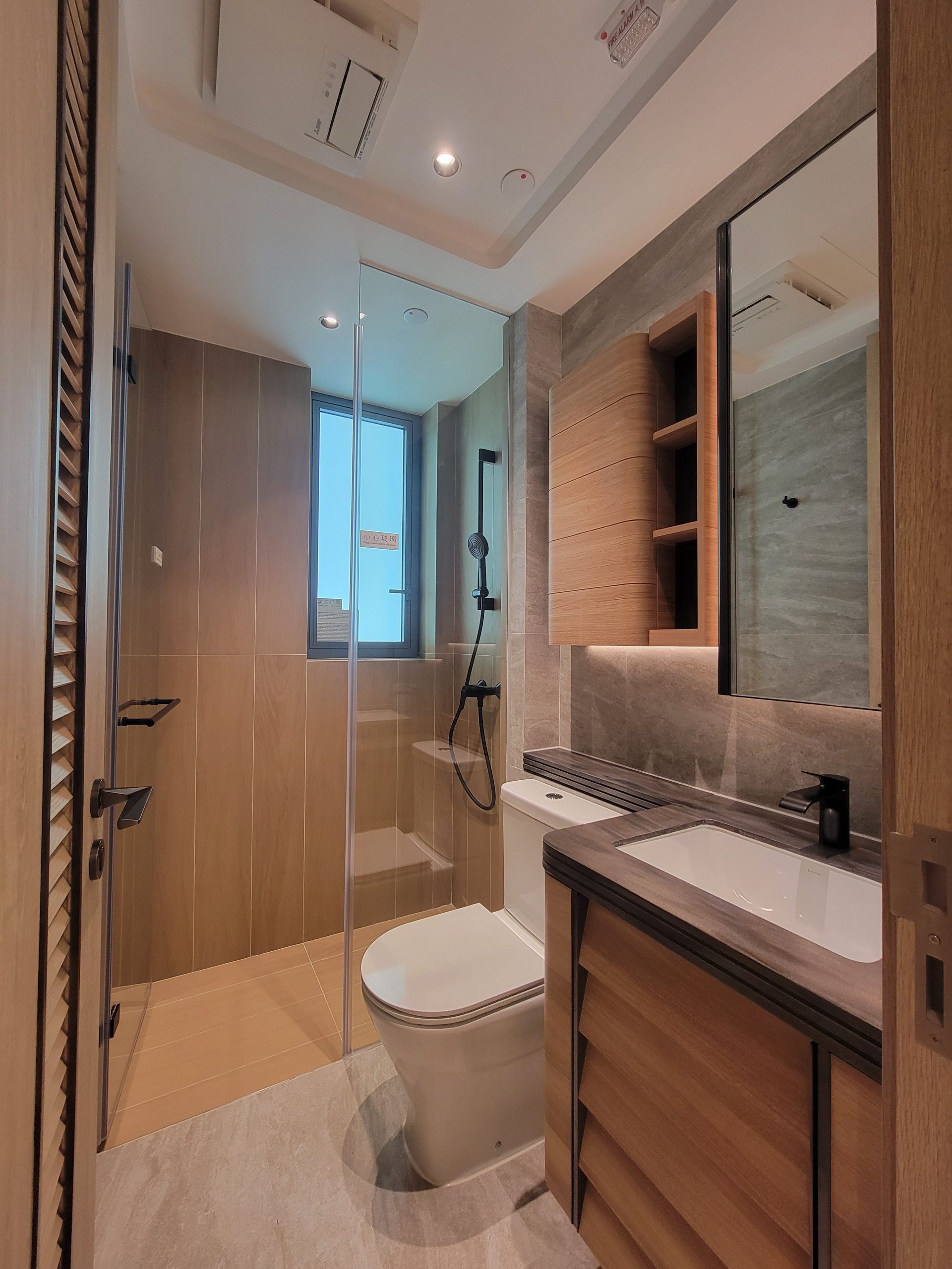 單位浴室採用明廁設計,增加採光及加強通風,洗手盆鏡櫃採用圓角設計,櫃內配置電插座,並且內設層架,方便住戶擺放風筒、香薰等家電或擺設;兩間睡房以蝴蝶型開則,間隔方正實用,提升整體空間使用性;主人睡房寬敞方正,並已預留位置放置衣櫃。所有房間均設有大幅玻璃窗,除增加室內採光度,住戶可安坐家中觀賞窗外自然景觀。
