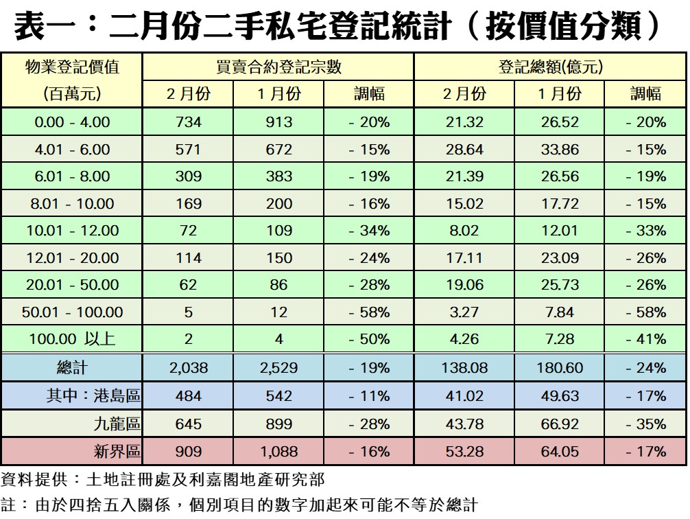 今年二月份,按二手私宅價值分類,九個價格組別的買賣登記量錄得全線下跌,當中以樓價5,000萬至1億元組別的跌幅最大,按月挫58%,至只有5宗登記,1億元以上組別及1,001萬至1,200萬元者亦分別跌50%及34%,至2宗及72宗。另外,登記量佔比最多為樓價400萬元或以下的組別,按月也跌20%,錄734宗登記(見表一)。