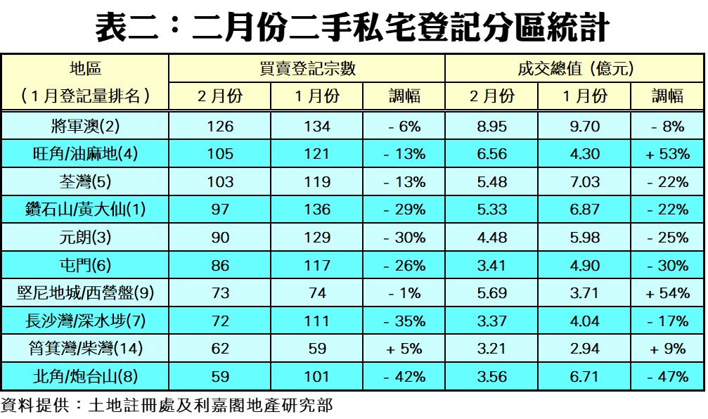 按全港三區作分析,二月份港九新界三區登記量全線報跌。當中,港島區登記量按月跌11%,月內錄484宗登記;九龍區按月大減28%,只得645宗登記;至於新界區也跌16%,千宗水平不保,只錄909宗。另外,十大最活躍成交分區的登記量則錄九跌一升,當中以北角/炮台山區的跌幅最大,月內僅錄得59宗登記,按月少42%。至於長沙灣/深水埗區及元朗區亦分別錄得35%及30%的跌幅,前者錄得72宗,後者則有90宗登記。