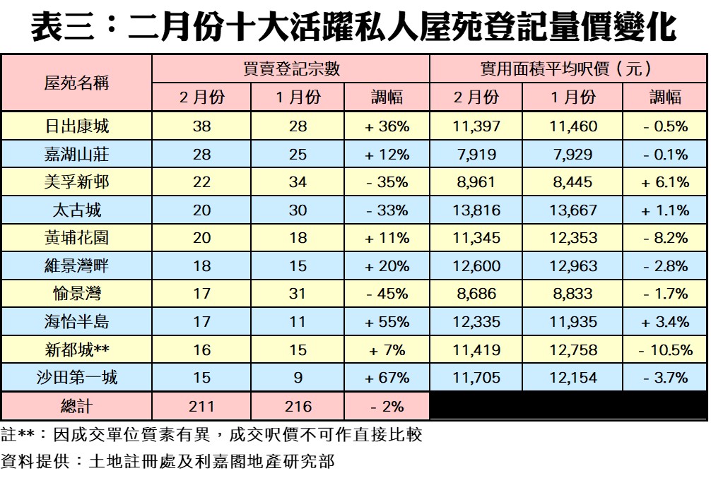 此外,上月十大活躍二手私人屋苑登記量中,錄得七升三跌,其中以沙田第一城的升幅最大,月內共錄15宗登記,按月大增67%;其次海怡半島也升55%,二月共錄17宗登記,而日出康城也漲36%,共錄38宗登記,成為登記量最活躍的屋苑。至於,登記量錄得跌幅者,以愉景灣萎縮幅度最大,按月少45%,只得17宗登記;而美孚新村及太古城也分別挫35%及33%,各自只有22宗及20宗登記。此外,二月份十大活躍屋苑總計登記量共有211宗,較一月份的216宗微跌5宗或2%。