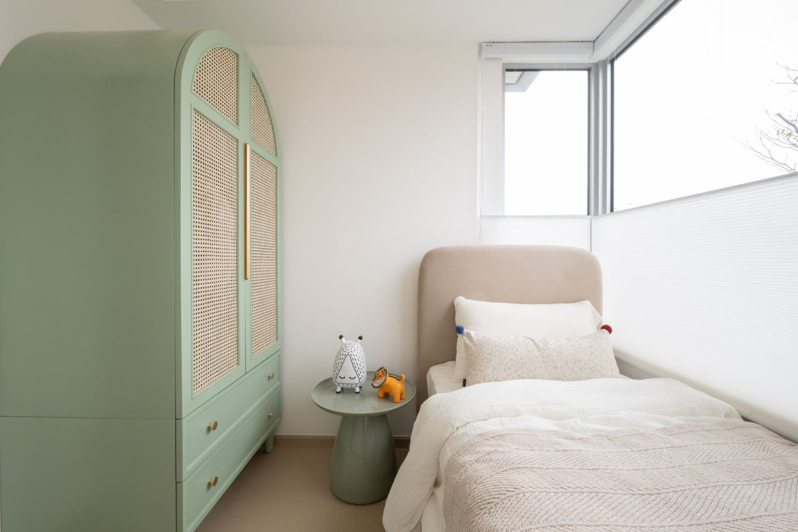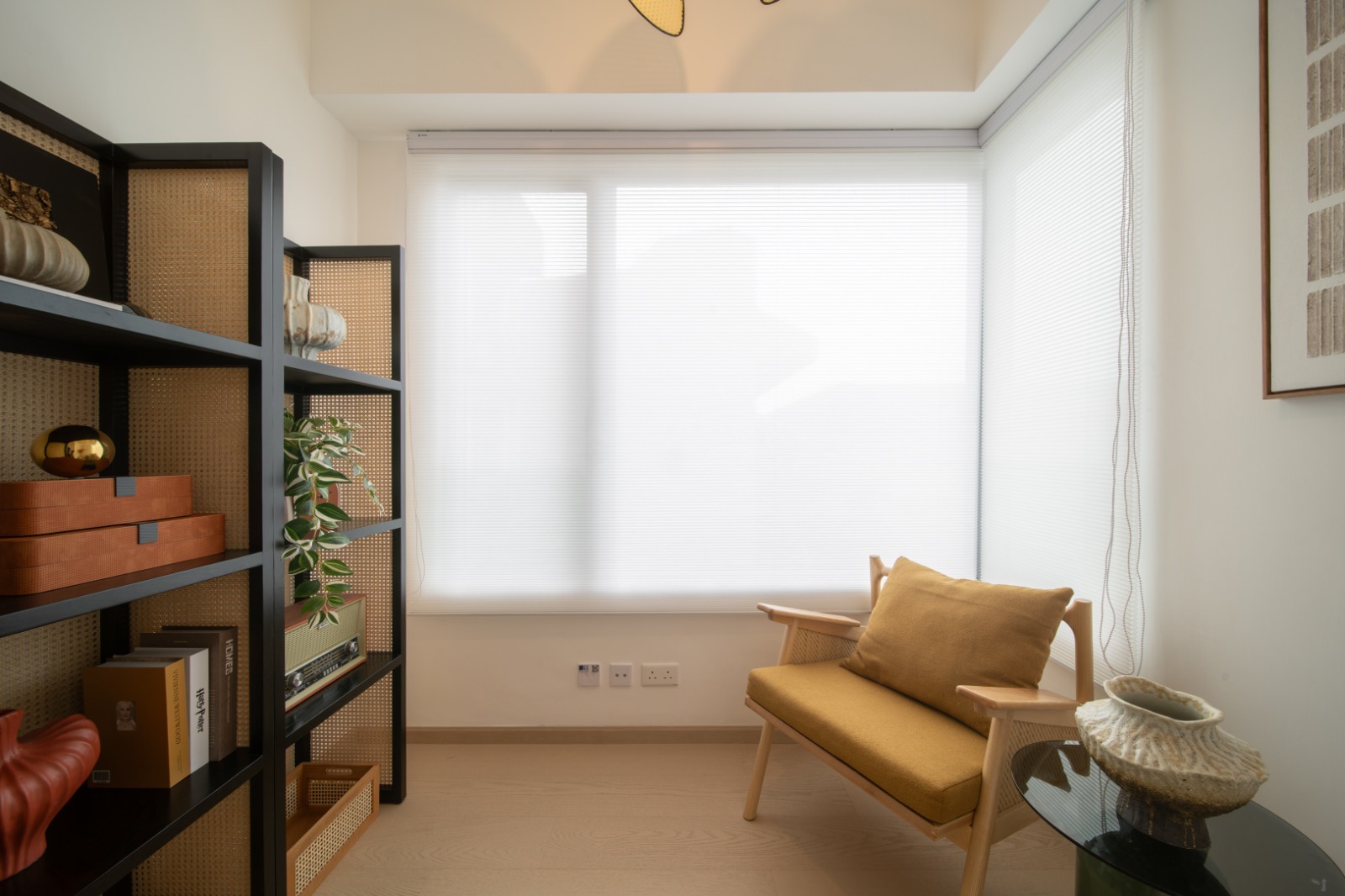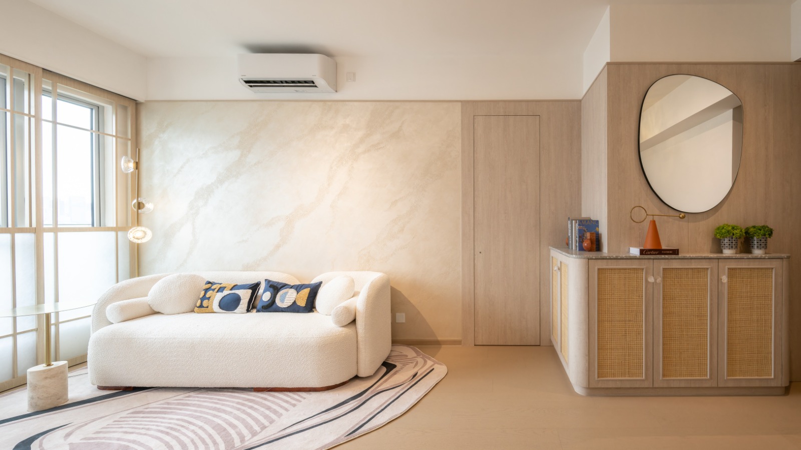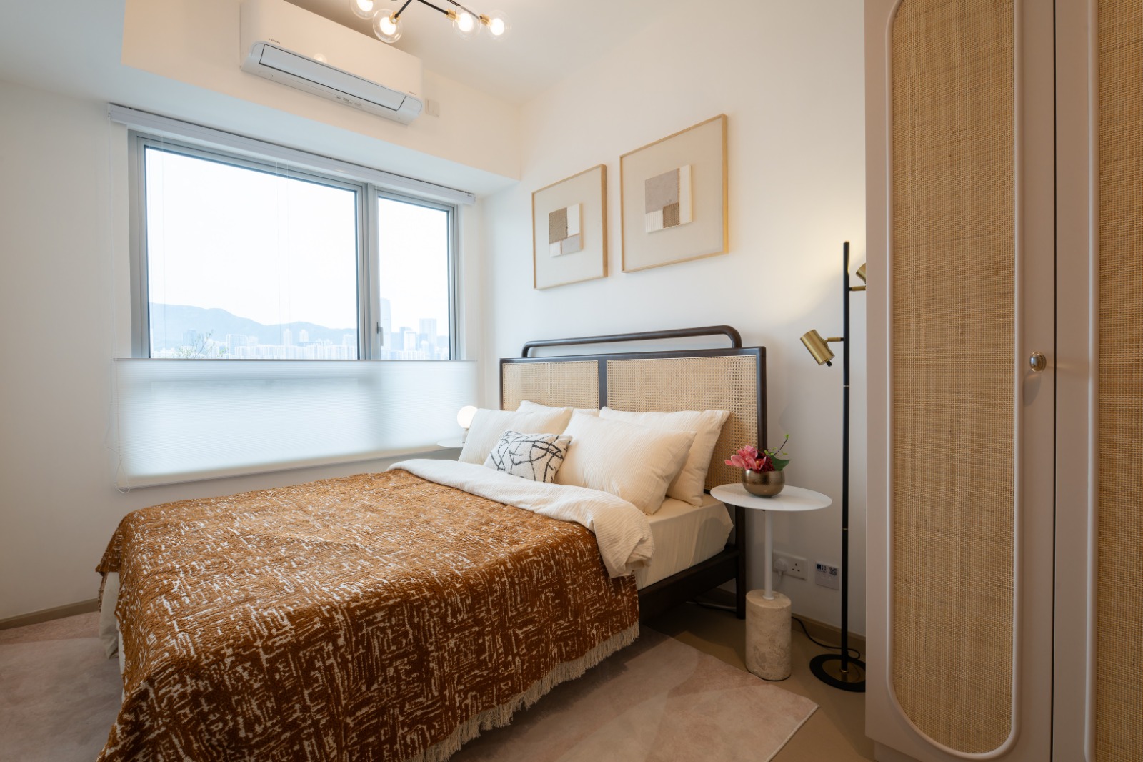 第1座1樓B室以近年流行的「侘寂風」悉心打造,用上靜謐舒緩的大地色為主調,傢俬用心選材,採用羊絨布藝、皮革、木紋飾面及織藤為主,將三房設計為兩間睡房及一間悠閒間,再配上多個實用的收納櫃,締造現代時尚名宅品味。