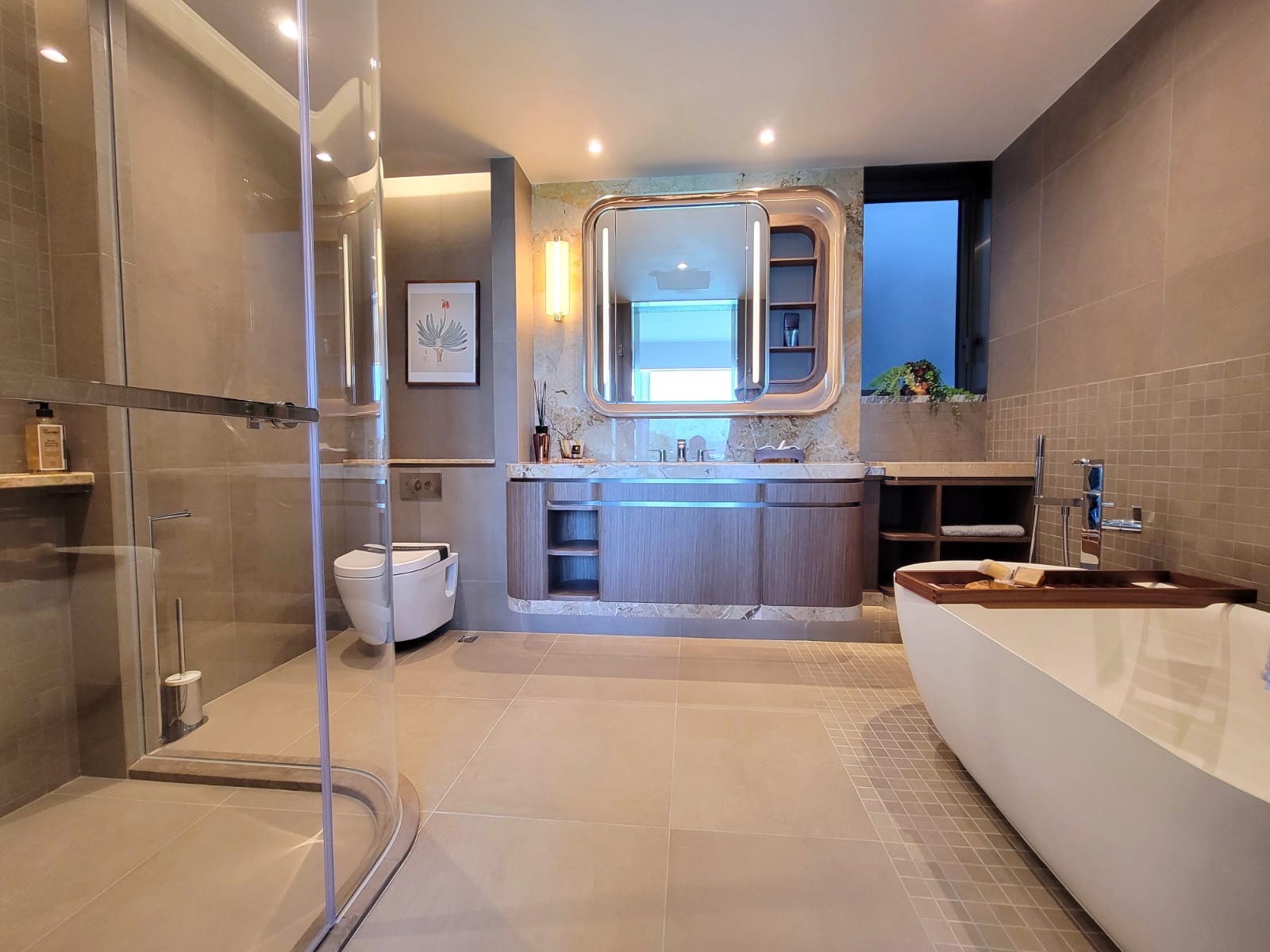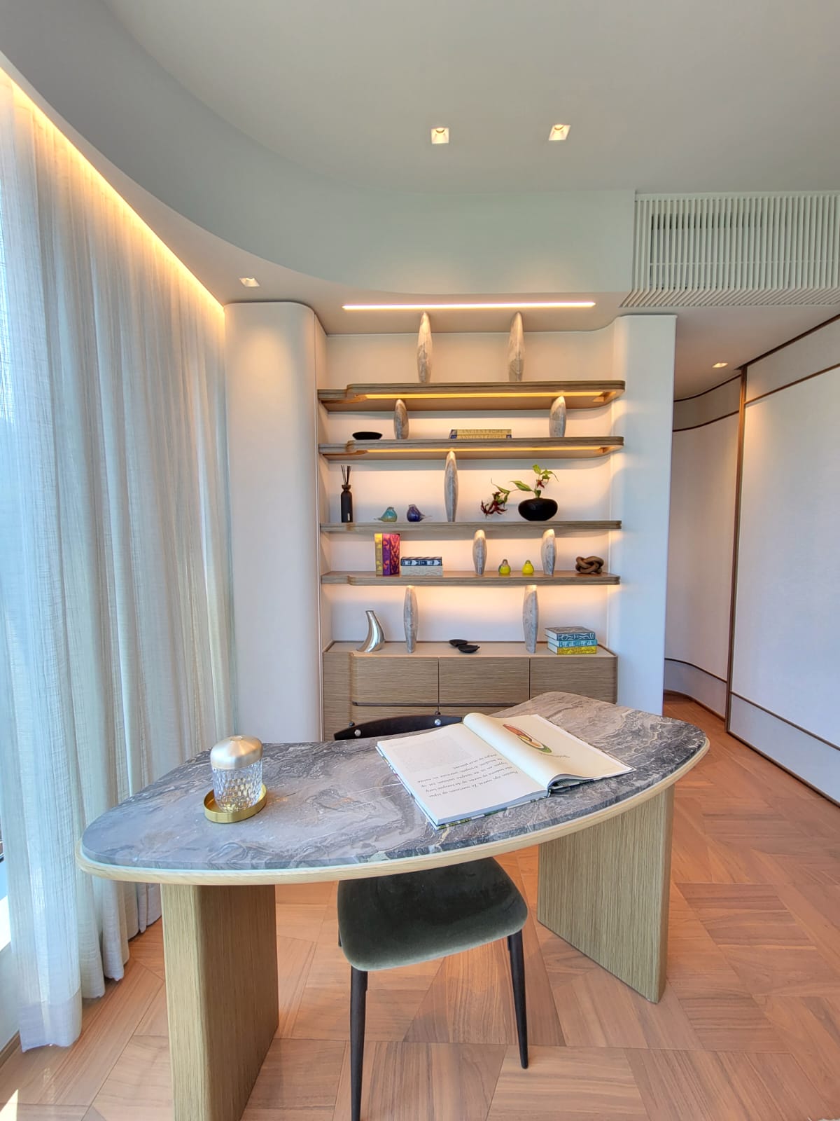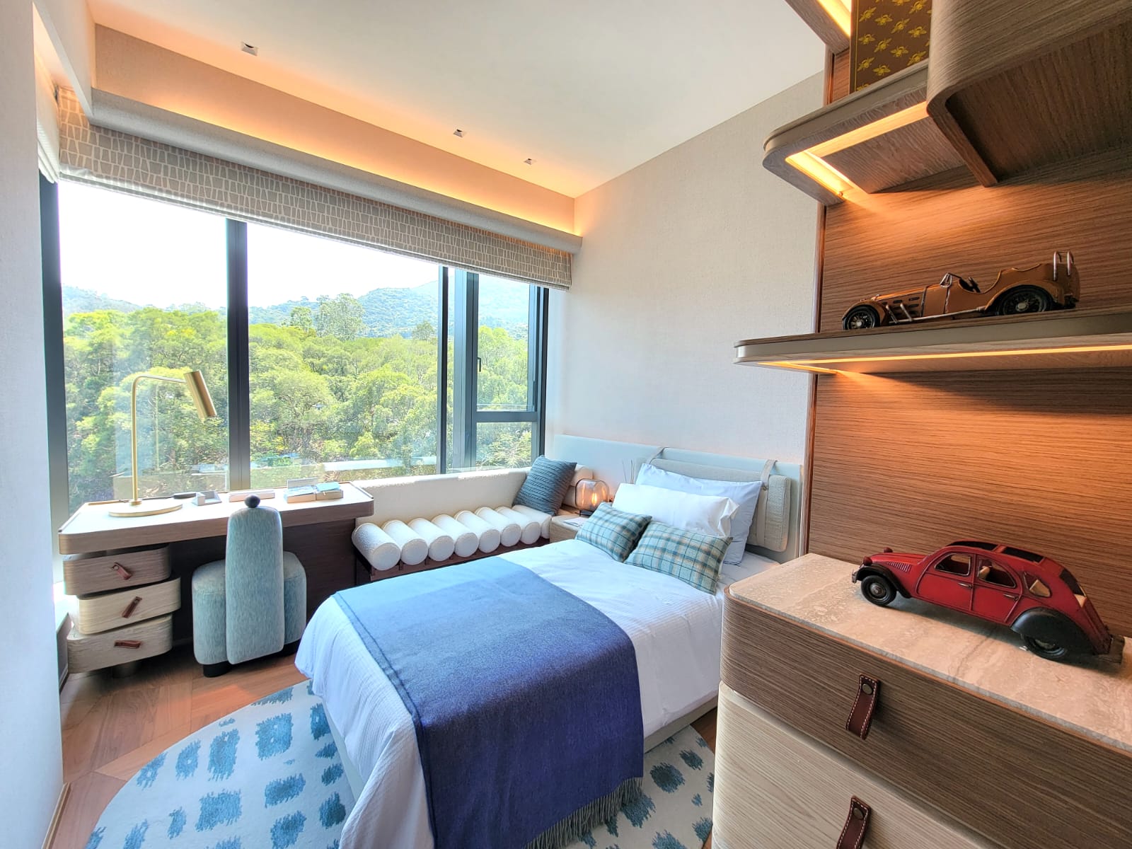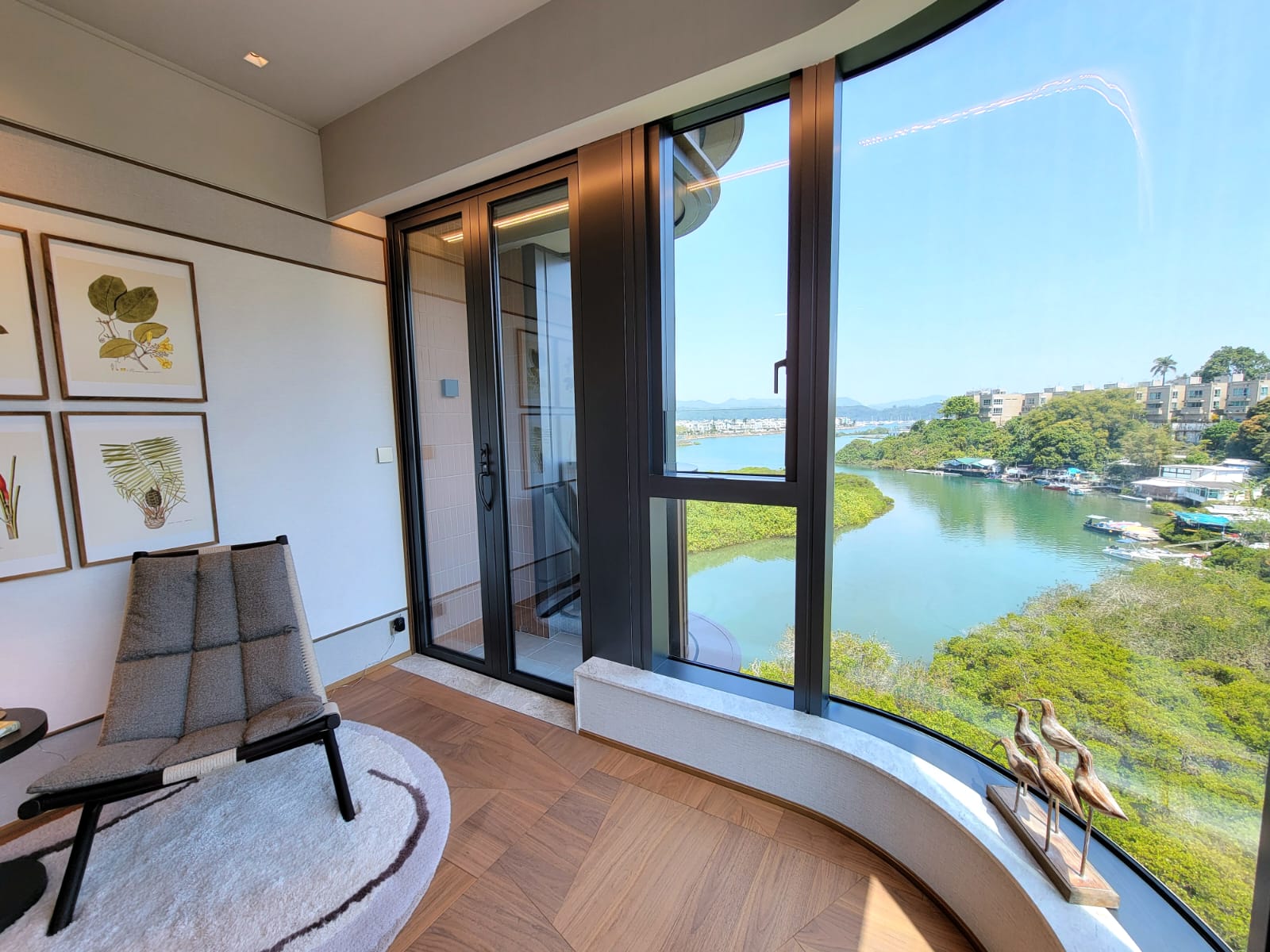 示範單位的設計主題為「Serene Retreat」,靈感源自眼前風光如畫的白沙灣及富有生命力的紅樹林自然生態區,設計師悉心將單位與周邊自然環境融和,連繫室內與外界醉人景致,為熱愛自然的家庭提供寧靜及溫暖的避風港。
