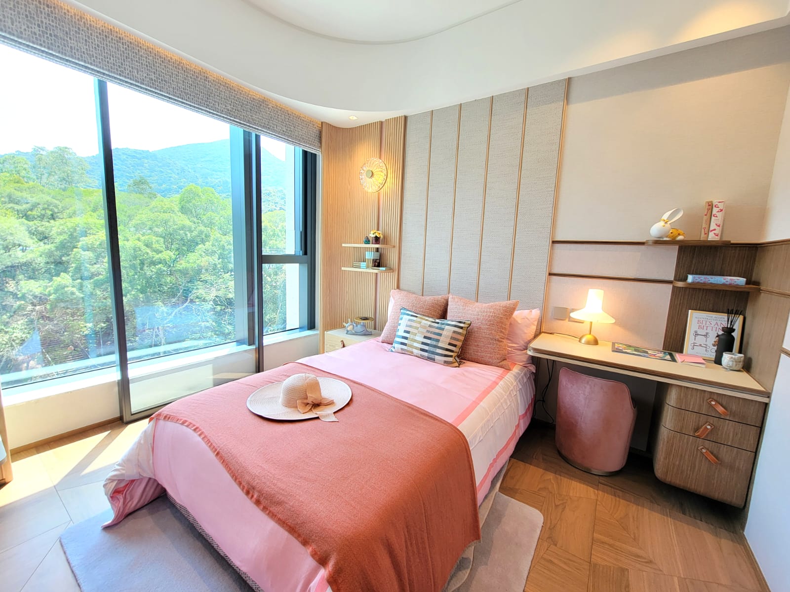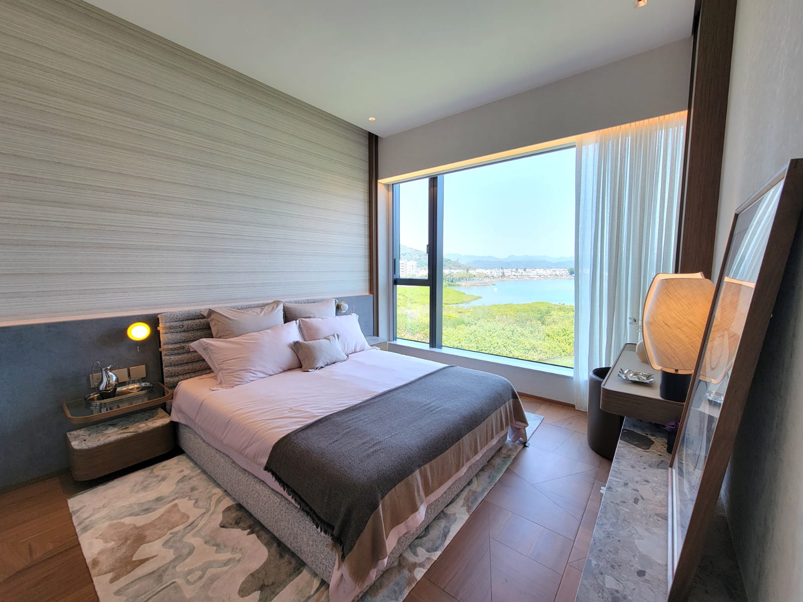 單位所有房間均為套房設計,臨海主人套房和書房與客廳同向,呈現銀幕式的白沙灣及紅樹林自然景致。另外兩間套房同樣照顧大戶家庭所需,悉心刻劃各具獨特性的私人空間,分別以灰色綴以粉綠色及粉紅色為主色調,配置書桌及梳妝台,加上玻璃大窗將周圍的翠綠山巒映入室內,閒逸優雅。