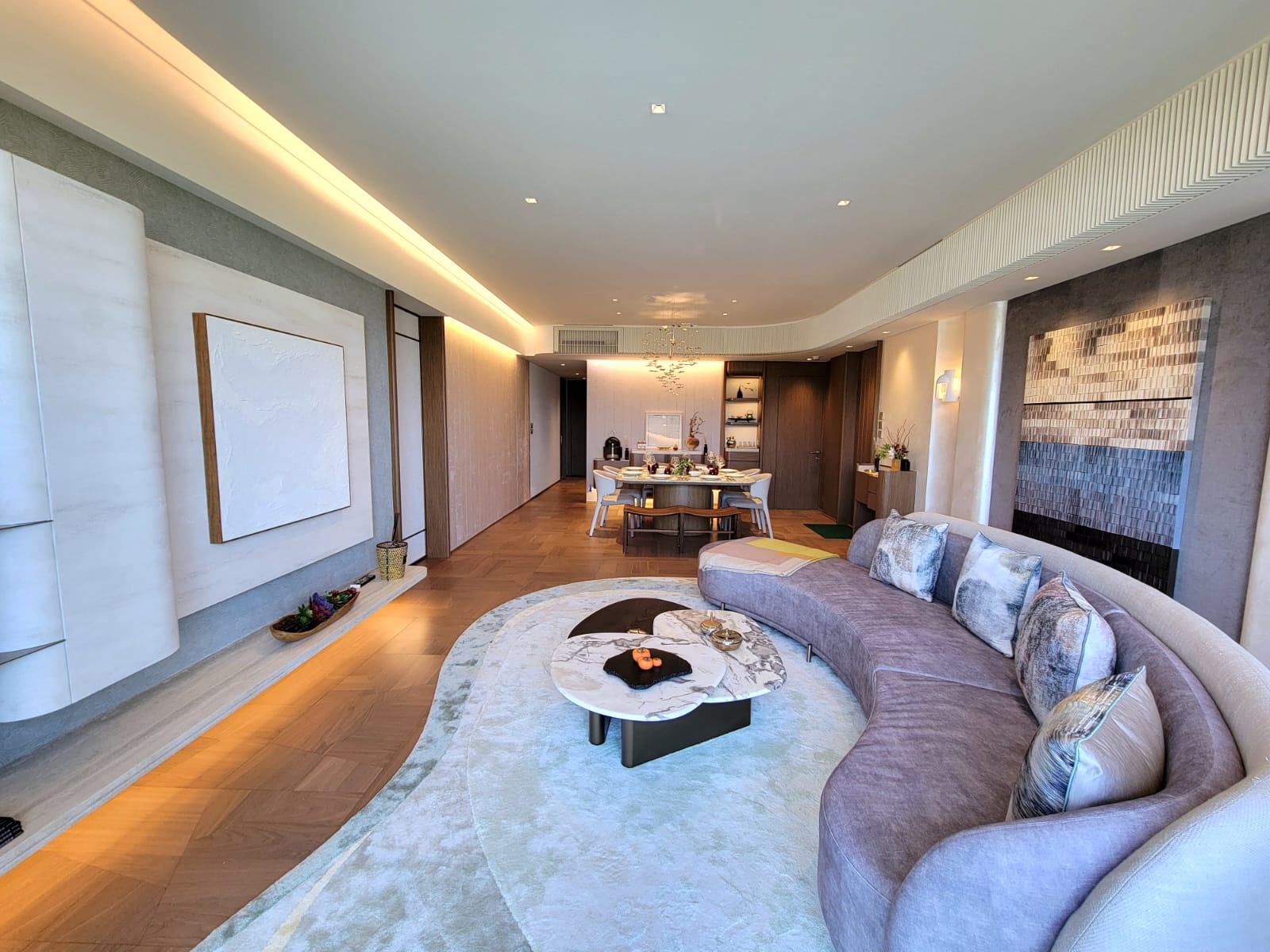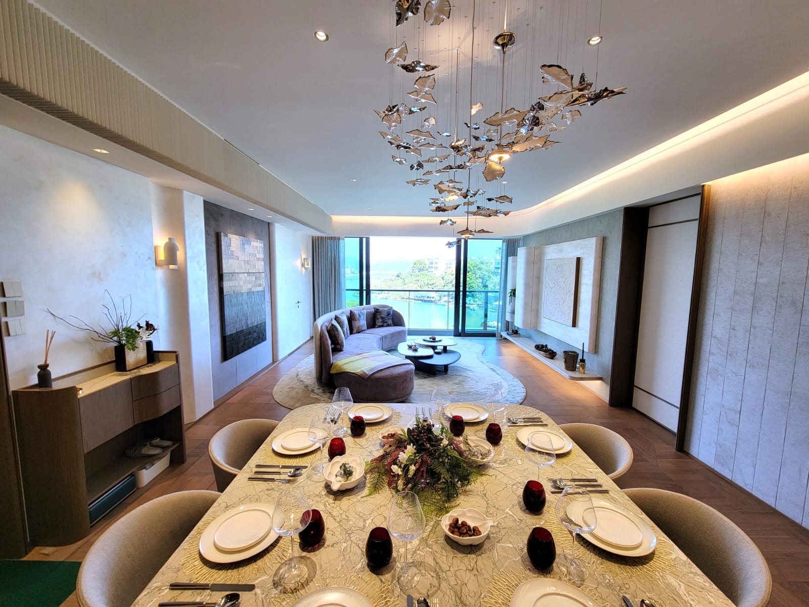寬敞的客飯廳接連50方呎「觀景大露台」,飽覽矜罕開揚多層次白沙灣景致,遠眺私人遊艇會風光。貫徹項目採用自然曲線的建築特色,客廳擺放特大的流綫型梳化及絲絨地毯,典雅與自然融和。飯廳設計同樣貴氣悠然,擺放8人大理石方桌,配以設計獨特及精緻的銀色吊燈,優雅不凡,吊燈名為「The Leaf」與戶外的大自然與紅樹林相呼應。