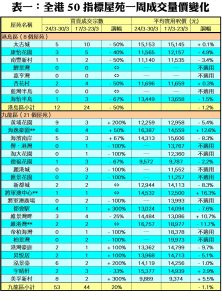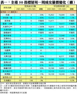 至於,九龍區21個指標屋苑上周共錄53宗交投,較前周的44宗增加20%,當中美孚新村都會駅交投升幅顯著,上周分別錄得8宗及4宗成交,按周激增3倍;黃埔花園泓景臺成交量按周亦有2倍增長,於上周分別錄9宗及6宗交投。此外,在全港50個指標屋苑之中,上周共有14個屋苑錄得「零成交」,較前周的9個增加56%,當中九龍區及新界區分別佔7個及4個屋苑,港島區則錄3個(詳見表一)。