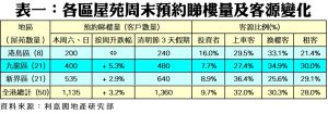 按地區劃分,港島、九龍及新界三區指標屋苑的周末預約睇樓量兩升一持平,其中九龍區升幅較大,該區21個指標屋苑於周末暫錄400組客戶預約睇樓,按周上升5.3%,而三天長假則約有480組客戶。利嘉閣地產黃埔二行高級聯席董事余美寶表示,近日多個新盤以低價搶灘,業主終於願意「鬆口」,吸引買家加快決定入市,二手市況迅速轉旺,其中黃埔花園及海逸豪園於三月份分別錄25宗及17宗買賣成交個案,按月分別增加10宗及7宗。不過,隨著二手筍盤被消化,伴隨鄰區將有全新盤開售,相信二手交投量或稍作回氣,本周末黃埔區預約睇樓量暫告平穩。