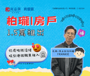 利嘉閣地產元朗-錦上路站柏瓏分行聯席董事鄭天樂(Frankie)稱,該行客戶董事陳力行(Alex)最新促成元朗錦上路新盤柏瓏I的租務成交,單位為1A期2座高層A2室,實用面積約356方呎,屬1房兼開放式廚房間隔,向東北,望內園景。