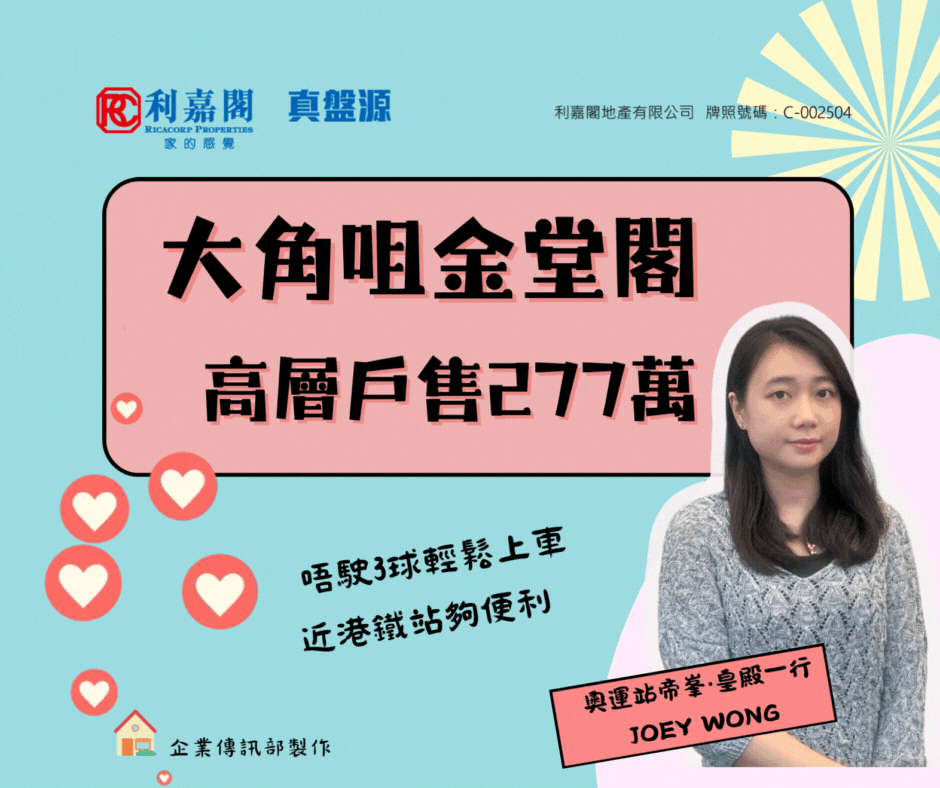 上車客3球樓下入手市區樓 斥277萬購大角咀金堂閣1房戶 Published 2025-04-20 · Updated 2025-04-17 利嘉閣地產新西九龍豪宅(奧運站)-帝峯皇殿一行高級聯席董事甘尚德(Kam)稱,該行客戶董事黃家欣(Joey)(圖)近期促成大角咀金堂閣高層F室的二手成交個案,單位實用面積約309方呎,採1房間隔,外望開揚樓景。 甘氏表示,新買家為上車客,早前經利嘉閣真盤源平台搵樓,見到上址放盤,即聯絡代理安排睇樓。客人喜歡屋苑位置便利,鄰近港鐵奧運站,附近民生配套齊備,加上單位間隔合用,隨即洽購。業主原開價318萬元,最後議價至277萬元成交,折合實用面積呎價約8,964元。 據悉,原業主於2014年以約273萬元買入單位,現帳面錄得微利。 同區二手筍盤同區新盤推介 促成代理 黃家欣Joey Wong客戶董事(S‑451084)新西九龍豪宅 奧運站 – 帝峯皇殿一行複製以下WeChat ID到WeChat以聯絡Joey WongWeChat ID:85265069328複製取消立即掃描QR Code聯絡代理香港:65069328複製取消