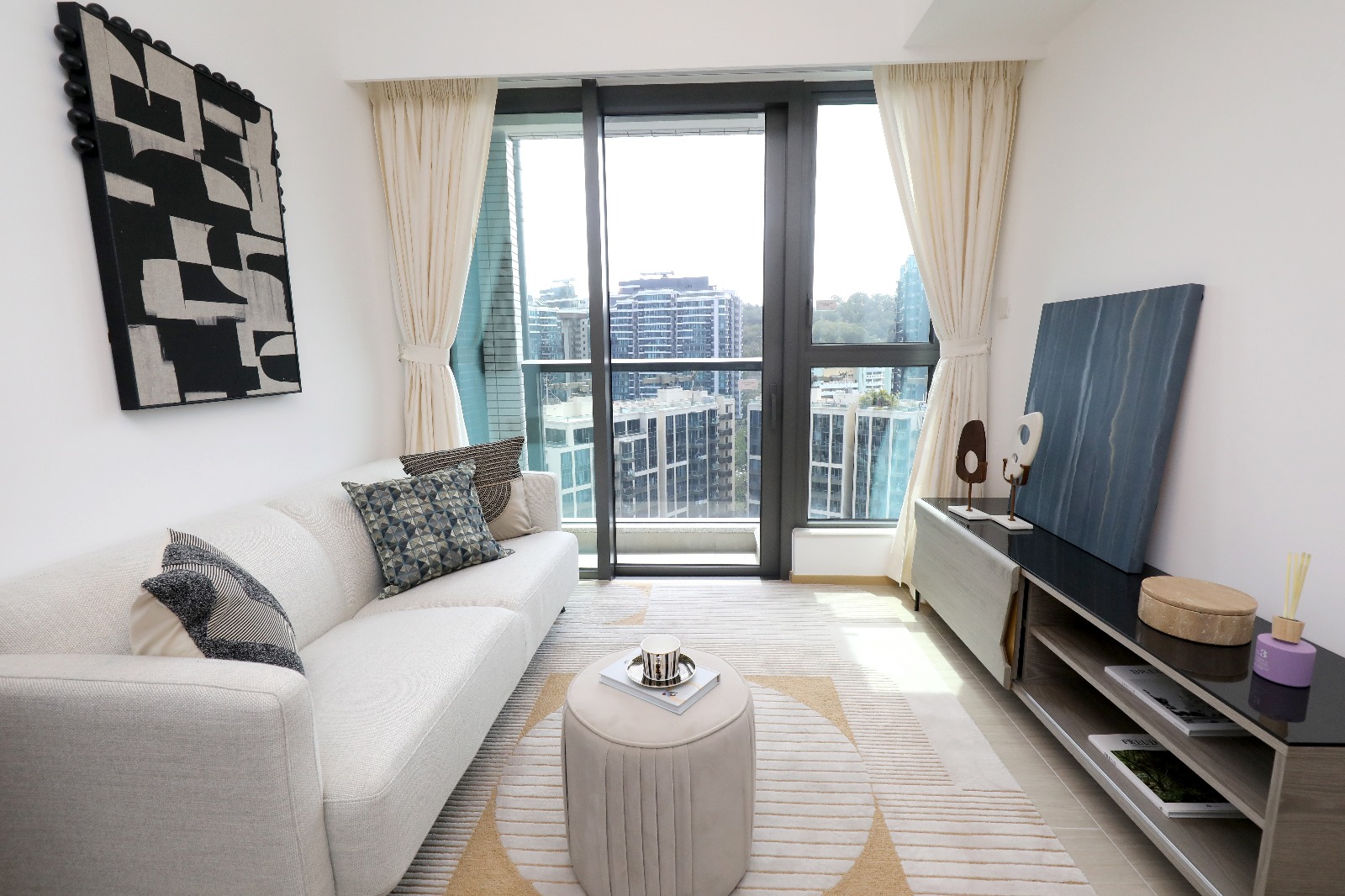 單位延續2025年度代表色Mocha Mousse(摩卡慕斯)為基調,加入海岸風格的紫藍色,營造出清爽的夏日氛圍。內櫳加入不同黑灰色紋理的擺設如大理石、金屬或幾何圖案的茶几和裝飾品,為空間增添層次與現代感,打造出兼具動感與型格的現代生活空間。