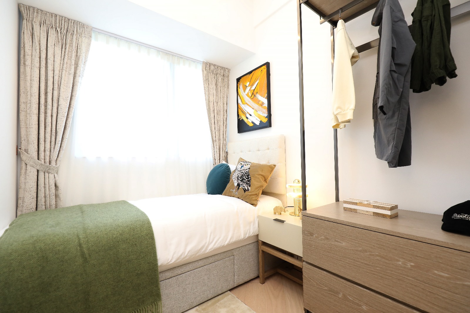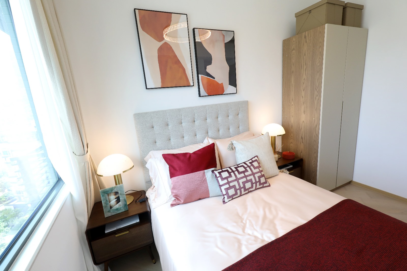 睡房1寬約2.05米,長約2.45米,開則寬敞實用,可根據需求靈活設計,如放置單人床、書桌或收納櫃,滿足多功能需求。睡房同樣以米白色為基調,加入少量紅色的家品如靠墊和藝術畫,增添活力元素。