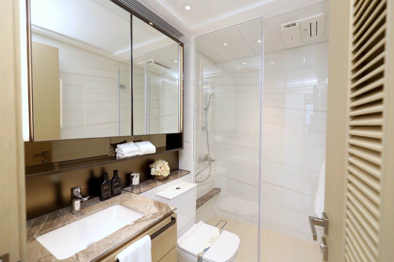 單位巧妙地應用不同的紅色色調並通過跳色搭配和金屬元素的運用,打造出時髦亮眼且充滿輕奢氣息的居住空間。長型客飯廳長約6.8米,寬約2.8米,採用開放式廚房設計,可放置四人餐桌,同時靈活擺放傢俬以區分不同功能區域。客廳連接22方呎的玻璃趟門露台及落地玻璃窗,提升室內採光度及引入鮮風,加上層與層之間的高度最高可達3.15米,空間感十足。