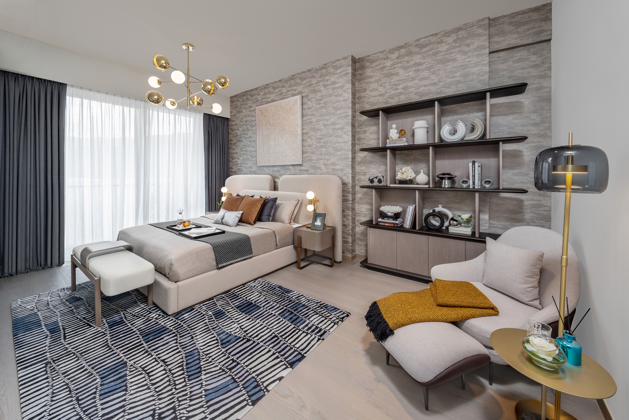 主人套房設廣闊大窗引入遼闊景致,實用面積逾400方呎,間隔靈活闊落,放置雙人大床及床尾長櫈後仍有足夠空間可三邊落床,房內更預留特大衣帽室。另一套房同樣以圓形貫穿整個設計主題,加入少量紅色元素。其餘兩間睡房同樣注入圓形設計,但格調與套房明顯略有不同,目的主要是為了凸顯戶主的兒子對於賽車的熱愛。設計師更特意將其中一間睡房改造為書房,為男戶主打造一個獨立的私人空間。頂層天台面積過千呎,設有大型戶外梳化及足夠十人同時聚餐的長形戶外餐桌。