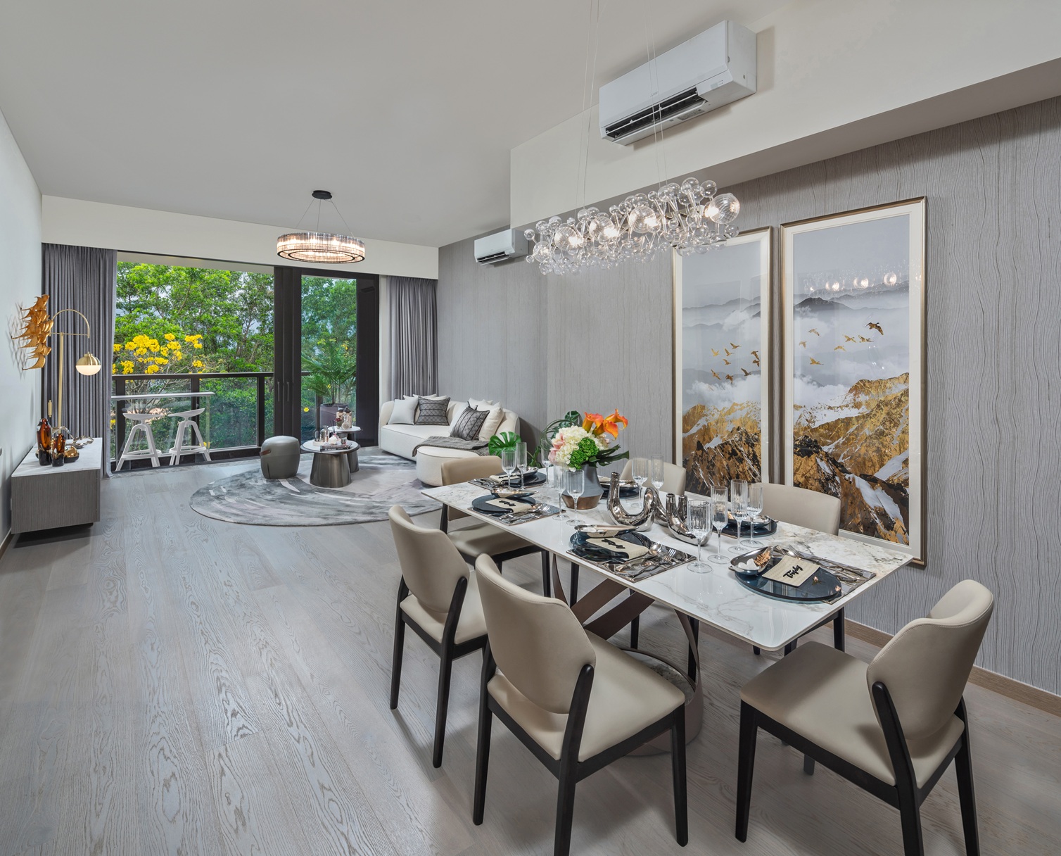 客飯廳採「日字型」開則,實用面積近400方呎,間隔方正實用,客飯廳分明。飯廳以長方形及灰色為主調,中間放置了一張長形雲石紋岩板6人餐枱。客廳裝修簡潔明亮呈現現代風格,以米白色V型的大梳化配以圓形地毯。