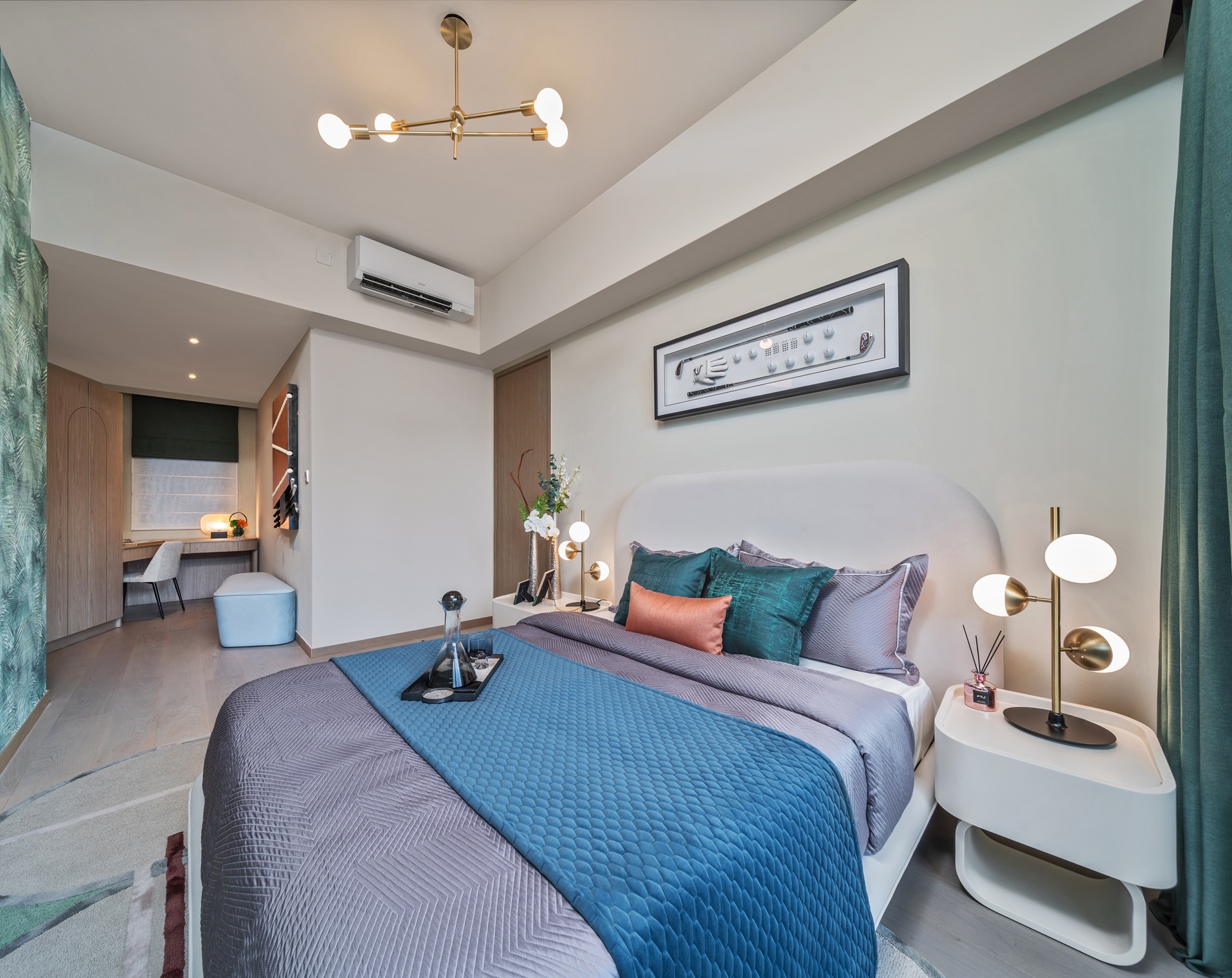 主人房睡床上方掛著屋主最愛的高爾夫球球棍、手套及高爾夫球等裝飾,配以床尾特色牆紙彷如置身綠油油的高爾夫球場之中,房內另設有大衣櫃及L型梳妝枱,牆身掛著高爾夫球及球桿作裝飾,正好與高爾夫球主題相互呼應。