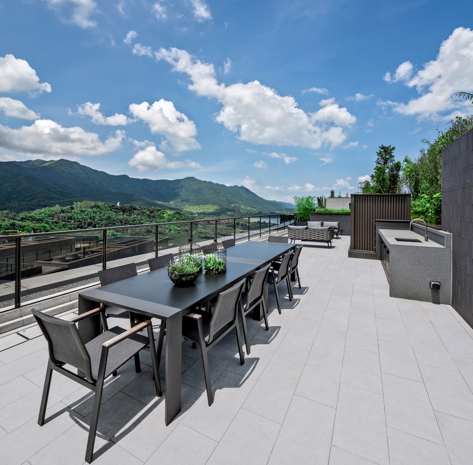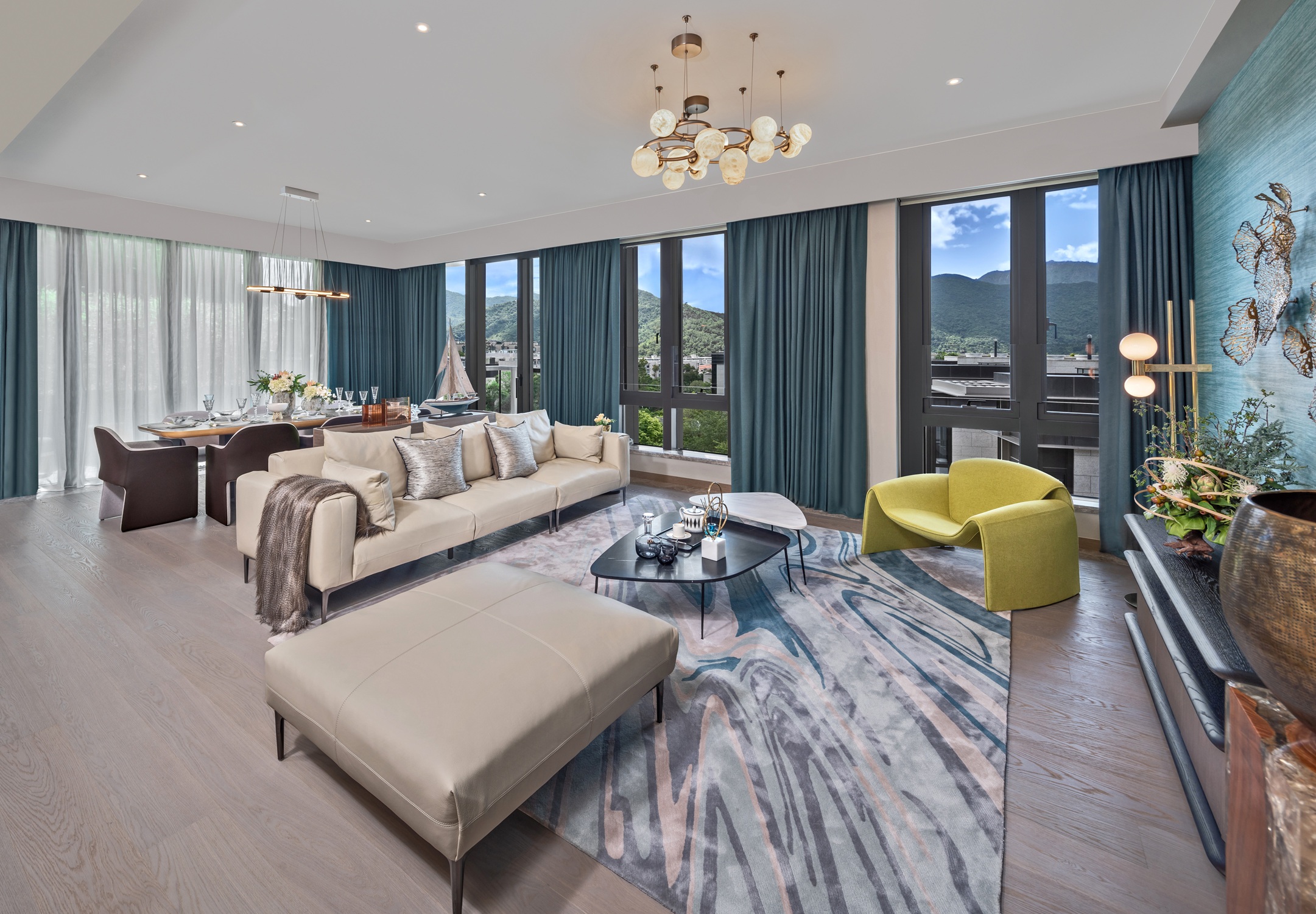 單位坐擁寬闊而且高樓底的客飯廳,客廳一幅碧藍水紋圖案特色牆,配以金屬荷葉掛飾點綴。客飯廳以落地玻璃窗連接面積約160方呎大平台,採光度特高,配襯白色窗紗及湖水藍的窗簾,清爽的微風和充滿活力的藍色主調,再加上氣泡般的圓形吊燈及坐地燈,活力感覺。飯廳裝修風格簡約,足夠擺放8人長形圓角餐桌。備餐區採用灰色石面廚櫃配襯白色雲石牆,中間放置雲石台面的酒吧枱配棕啡色高椅。廚房配備國際知名德國品牌廚具設備如Gaggenau及Dornbracht等,加上意大利Modulnova高級廚櫃組合。室內明確劃分出「Back of House Area」的後勤空間,用以打點家務,並有獨立副出入口連接公共升降機大堂,讓主、客空間分明,更顯高貴氣派及私隱度。