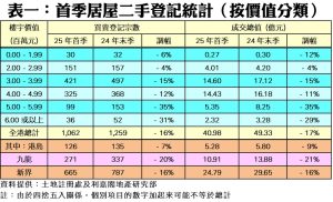按樓價作分析(見表一),6個價格組別交投量全線下跌,其中跌幅最大的是價值500萬至600萬元以內組別,今年首季登記宗數僅99宗,按季急挫35%或54宗;至於登記量最活躍的300萬至400萬元以內組別則錄421宗,惟仍較去年末季的497宗減少15%。如以地區劃分,九龍區期內跌幅較大,由前季337宗減至上季271宗二手居屋登記,按季下跌20%;而新界區首季則錄665宗登記,按季減少16%;至於港島區期內錄126宗,較前季微跌7%。
