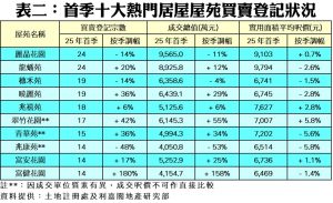 如按屋苑細分(見表二),2025年第1季屯門兆康苑錄14宗買賣,按季銳減48%,而上述屋苑成交總值錄約4,050.8萬元,較去年第4季同步急瀉53%。至於九龍灣麗晶花園及鑽石山龍蟠苑則同以24宗買賣登記並列期內交投活躍榜首,成交總值分別涉資9,565萬元及8,925.8萬元。