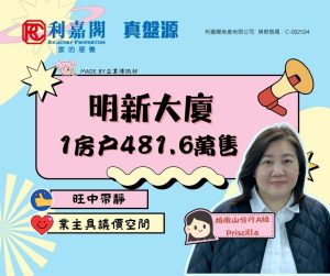 利嘉閣地產北角及北半山高級分區董事梁啟豪(Ken)稱,柏傲山分行A組物業顧問梅仿瑤(Priscil­la)新近促成大坑明新大廈高層B室的二手成交個案,單位實用面積約602方呎,採1房間隔,外望開揚市景。