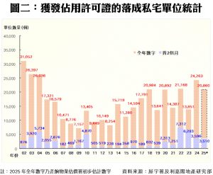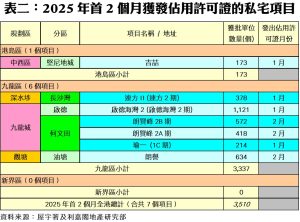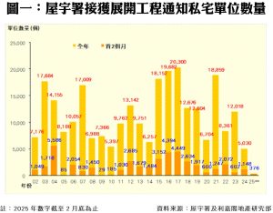 此外,私人住宅落成量方面,根據屋宇署今日最新發表的資料月報顯示,2025年二月份全港共有3個項目,合共1,624個私人住宅單位落成(以屋宇署發出佔用許可證的樓宇數量為準),為五個單月最少;今年首兩個月累計共3,510伙私宅落成,較去年同期的3,596伙減少2%,為四年同期新低。