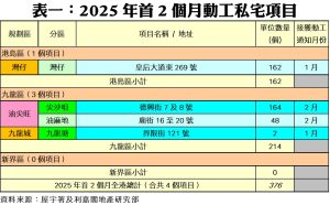 利嘉閣地產研究部主管陳海潮表示,未有大型私宅項目動工之下,近月動工量持續偏低,根據屋宇署今日發表的最新數據,2025年二月份全港共有2個私人住宅項目,合共212伙動工(按屋宇署接獲上蓋建築工程動工通知為準),較今年一月份的164伙增加29%,為六個單月最多;今年首兩個月私宅動工量累計376伙,較去年同期減少67%,並創過去十五年同期新低;其中二月份動工項目包括佐敦德興街7及8號(164伙)及油麻地廟街16至20號(48伙)。