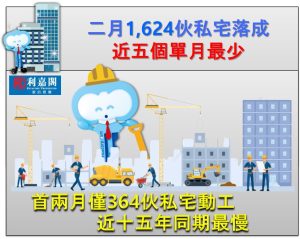 二月份1,624伙私宅落成 五個單月最少 期內212伙私宅動工 十五年同期新低