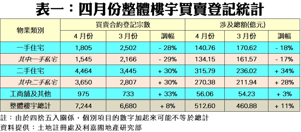 二手住宅市場方面,持續受惠《財政預算案》放寬100元印花稅至400萬元物業,加上趁新盤推售出現空窗期,刺激二手市場接力造好,結果推動四月份二手私宅買賣錄得3,650宗,按月持續大升30%,重上最近12個月高位,突破三千六百宗水平;至於月內登記總值相應增加28%,達270.38億元,繼續展現量值齊升的旺勢。
