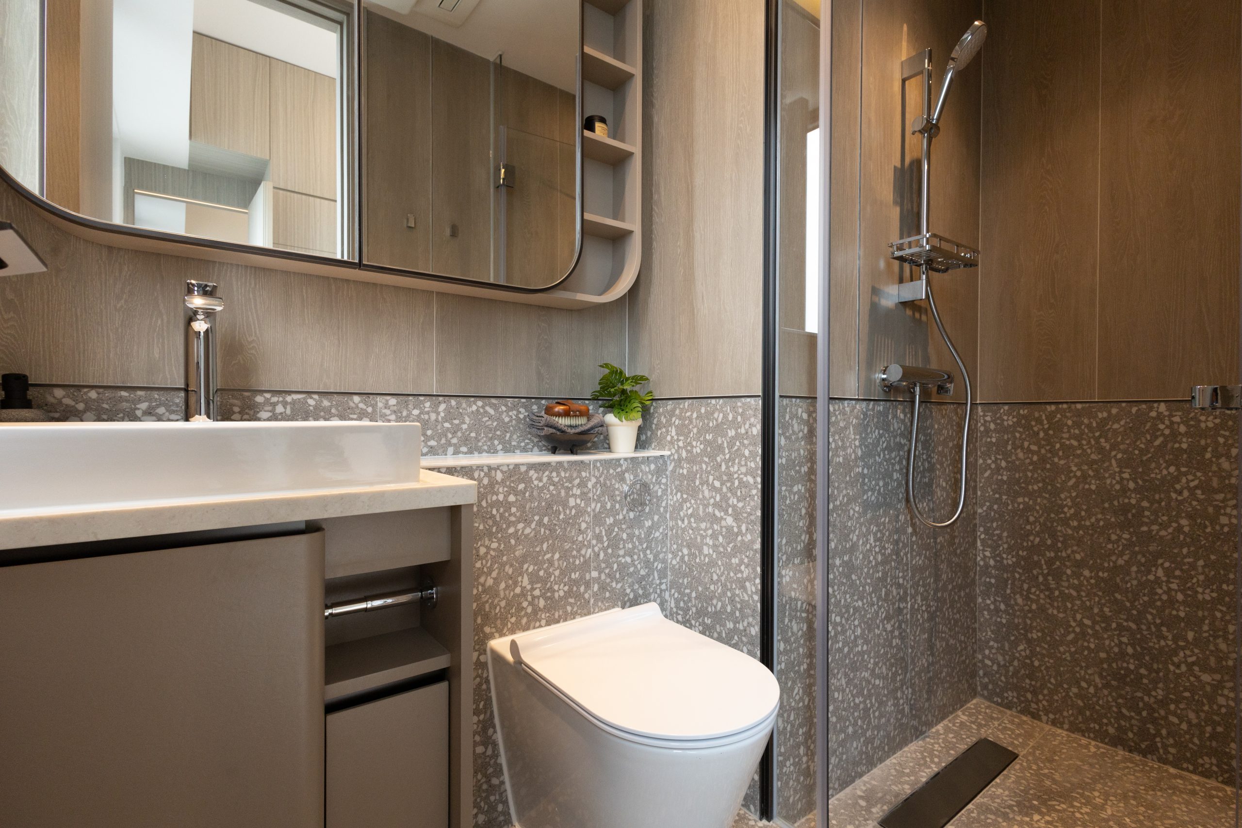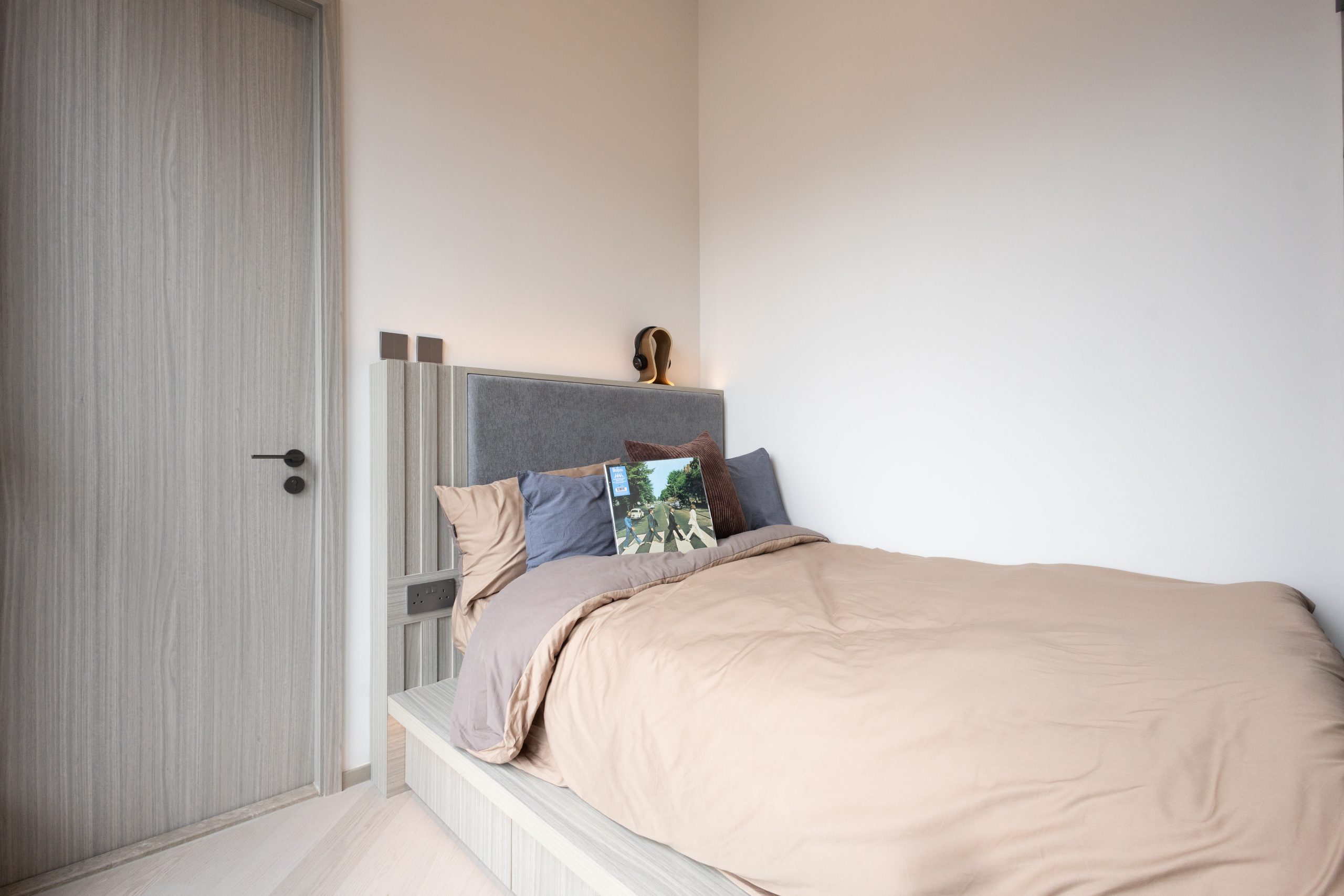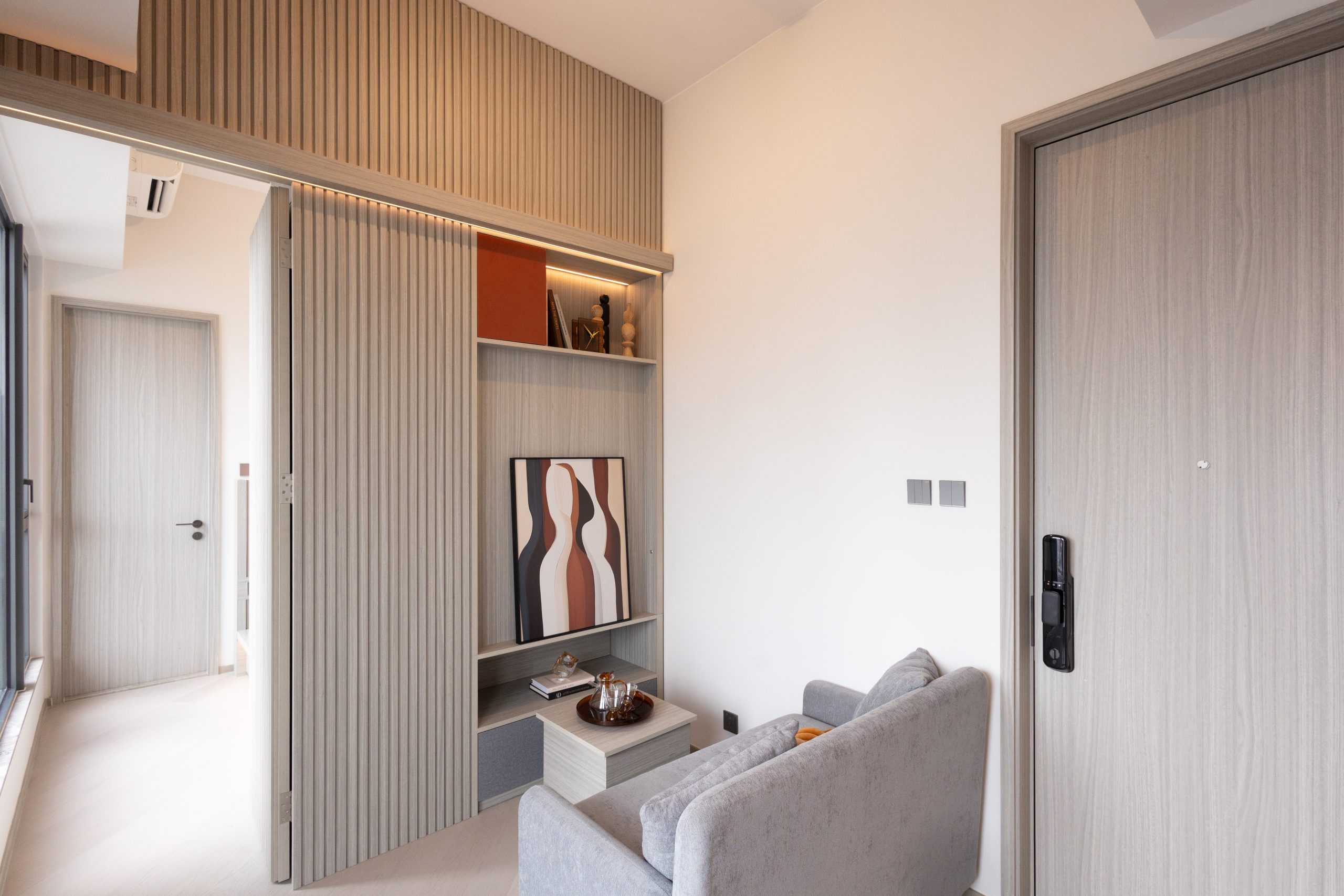 單位採用一體化的複合式傢俬設計,以雙面收納櫃作間隔空間,可明確地劃分開寢區及廳區兩個空間,提升私隱度與實用性。寢區設有層架及衣櫃,床下亦設有收納櫃放置衣服。