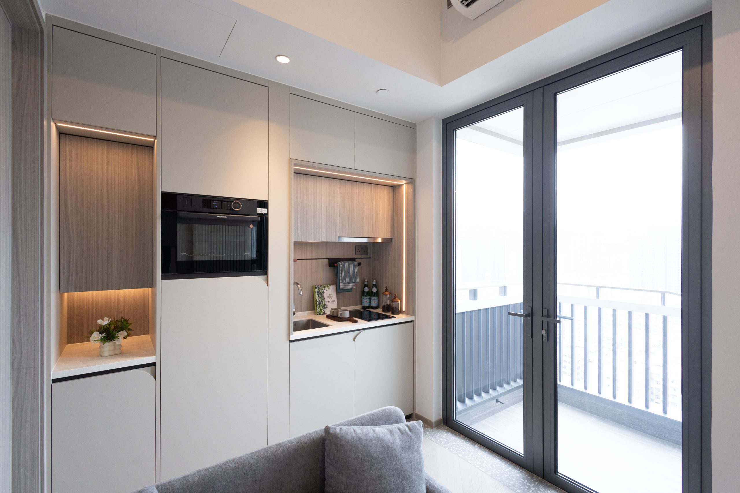 開放式廚房配備嵌入式由地面至假天花的高櫃,廚櫃配以天然木紋色系及高雅New Blanc新皓白色櫃門,另配備法國品牌De Dietrich的電磁爐、蒸焗爐、歐洲品牌Gorenje抽油煙機。