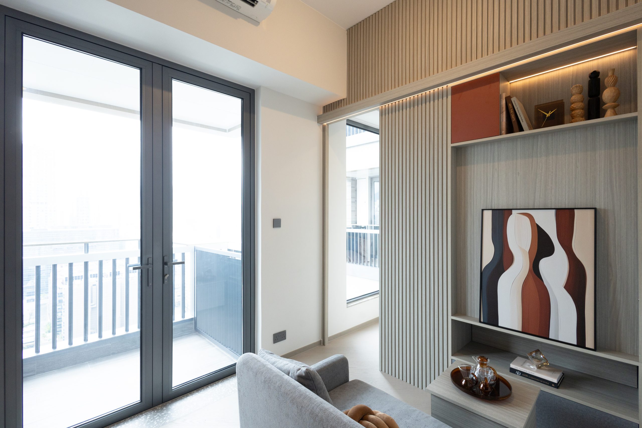 客飯廳空間寬敞,設有到頂電視櫃,亦具備儲物空間,兼具功能實用及美學;廳區擺放多功能茶几,能靈活升降,亦有收納空間,滿足不同生活需要。單位露台與工作平台合併,成為室內居室的延伸,住戶能更靈活運用露台空間,可擺放小桌椅或盆栽;露台採用市場罕有雙門設計,朝向東北方向,享開揚九龍城景及山景。