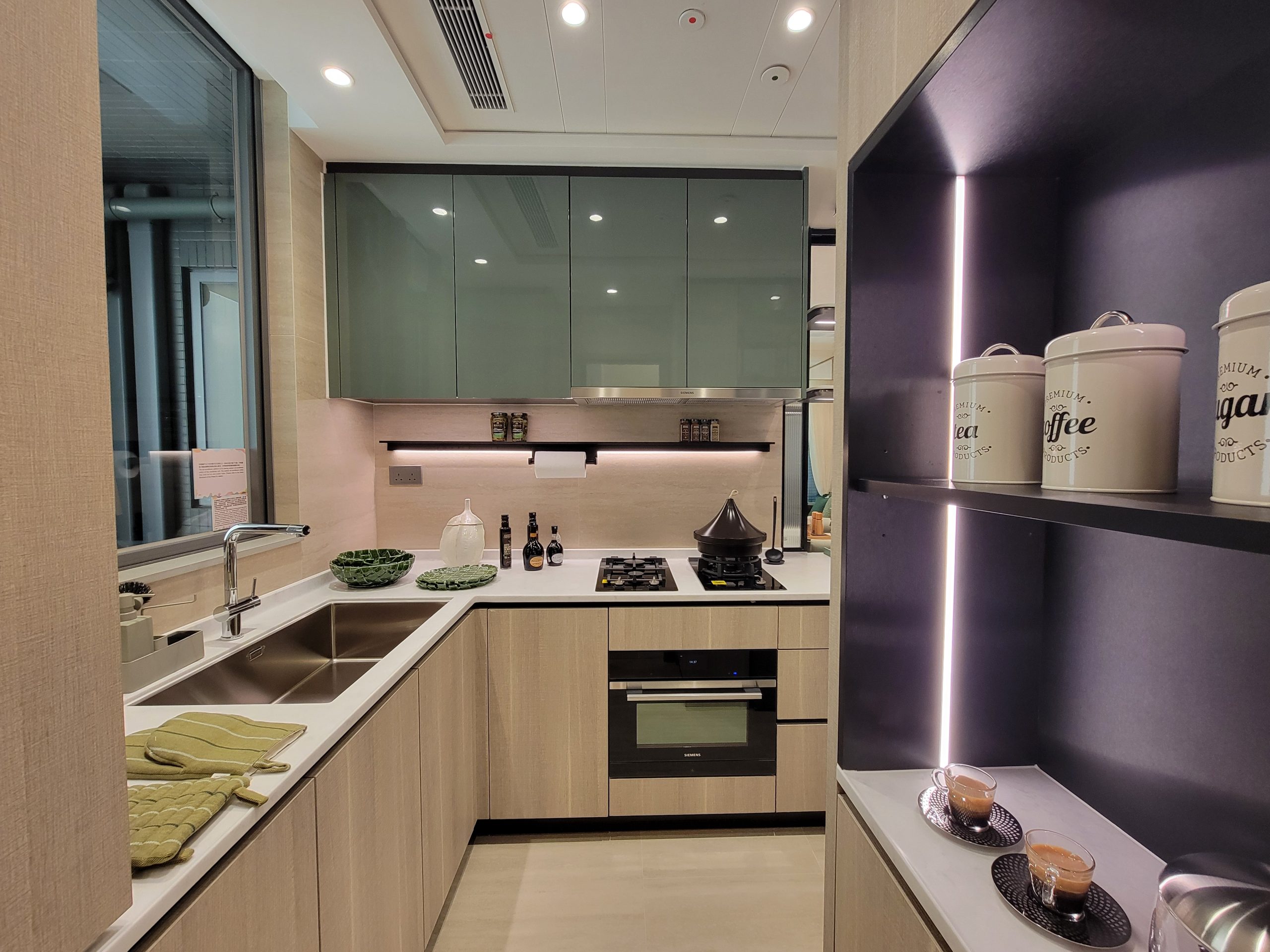 廚房以開放式廚房連半透明立體條紋雙門設計,地板以米色雲石紋瓷磚舖砌,廚櫃亦用上同樣色系,襯以淡雅雲石工作檯,營造出融入大自然的簡約清新度假風。廚房呈長方形,布局工整實用,窗戶和半透明雙門設計加強了空間的明亮通透度,能有效隔絕油煙,廚房中配備L型工作檯面,提供充足的烹飪和準備空間,牆上巧妙設置的置物架方便日常烹飪使用,洗滌區旁亦貼心備有置物層架,整理煮食用具更輕鬆。設有完善的廚房設備,包括Bosch雪櫃、Siemens的7合1智能微蒸烤焗爐、拉趟式抽油煙機、嵌入式單頭及雙頭煤氣爐、洗衣乾衣機,一應俱全,讓住戶享受入廚的樂趣。轉角更有展示櫃連燈帶,提升廚房的格調。開放式廚房連接工作間,內設獨立洗手間,妥貼善用空間。