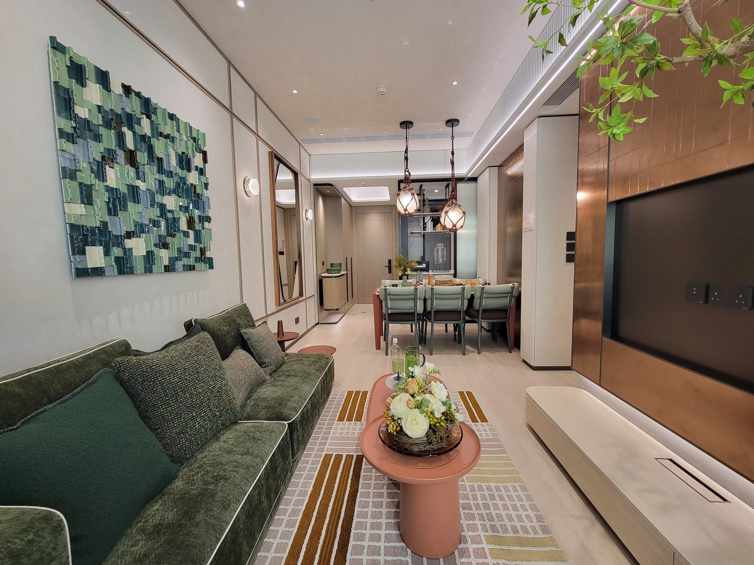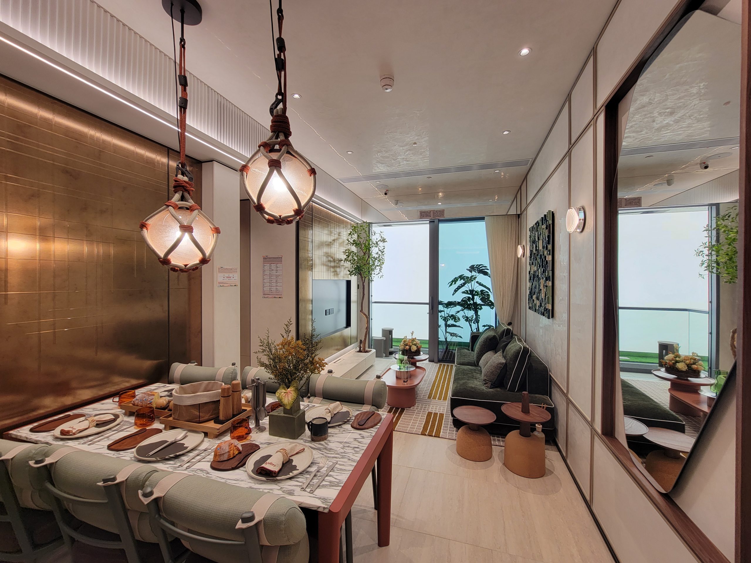 客飯廳呈長方形設計,長約7.87米,寬約2.8米,方便擺放各式家具,靈活性高。面積寬敞的客飯廳連接露台,玻璃趟門設計迎納自然光線,提升了採光效果與空間感,感覺份外開揚,窗外自然景色一覽無遺。客飯廳採用淡雅米色雲石紋瓷磚,與金色復古線條雕刻特色鏡面電視牆形成既鮮明又不失和諧的色彩對比,為客飯廳增添高尚氣派。飯廳選用大理石檯面的長形六人餐桌,配上淡綠色戶式餐椅,餐桌旁採用復古金屬色牆面設計,洋溢摩登高雅氛圍。天花掛上露營風麻繩玻璃浮球吊燈。客廳放置墨綠色絨面梳化,搭配深淺不一的同色系抱枕,並鋪上型格拼色格紋地毯,中央擺放赤陶色橢圓造型茶几組合,仍顯空間寬敞。沙發上方掛上立體藝術裝置,處處展現型格潮流的生活品味。