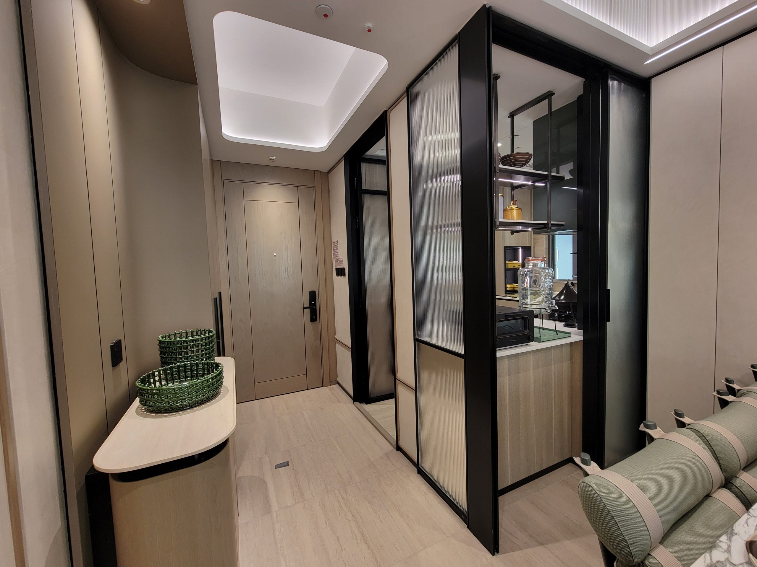 客飯廳及各房間配備窗簾,優化採光及遮光效能,住戶可善用空間,打造幸福理想居所。單位間隔靈活寬敞,大門採用實心木門設計,配備LOCKLY智能電子門鎖,設有多種開鎖方式,包括內置密碼、3D指紋感應及RFID拍卡等,更有專利防偷窺電子按鍵技術,提高私隱度,便利至極。大門側旁設有儲物櫃,內附多格層板,方便住戶整理鞋履及收納家庭用品,牆上更設USB充電插座,便利實用。客飯廳及睡房的玻璃幕牆特別採用low-e塗層IGU玻璃,強化隔音隔熱功能,締造舒適恆溫的住所環境。大門後方透過明窗和全身鏡的巧妙配置,提升空間感及時尚感之餘,亦方便住戶日常出門前檢查衣著打扮。