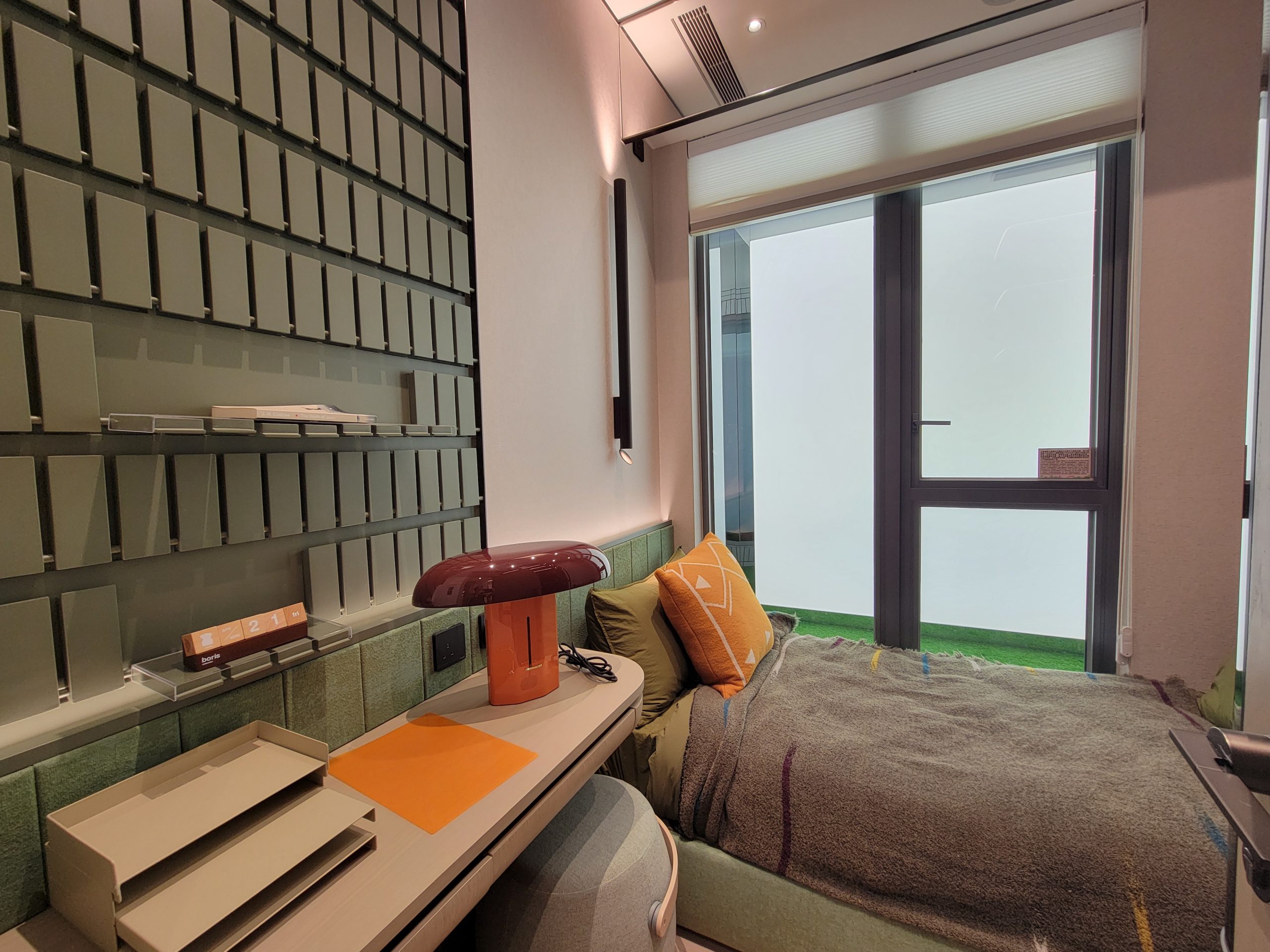 睡房1以大自然為主題,牆身鑲嵌一面莫蘭迪綠色摺疊方塊壁,極具簡約時尚設計感,可以用以放置不同裝飾,打造個性化房間。沿用淺原木色方形書桌,與摺疊方塊牆壁相映成趣,形成舒適的學習區。茶色透明衣櫃擁流線形櫃邊,既時尚又貼心,提升睡房的實用性和安全性。