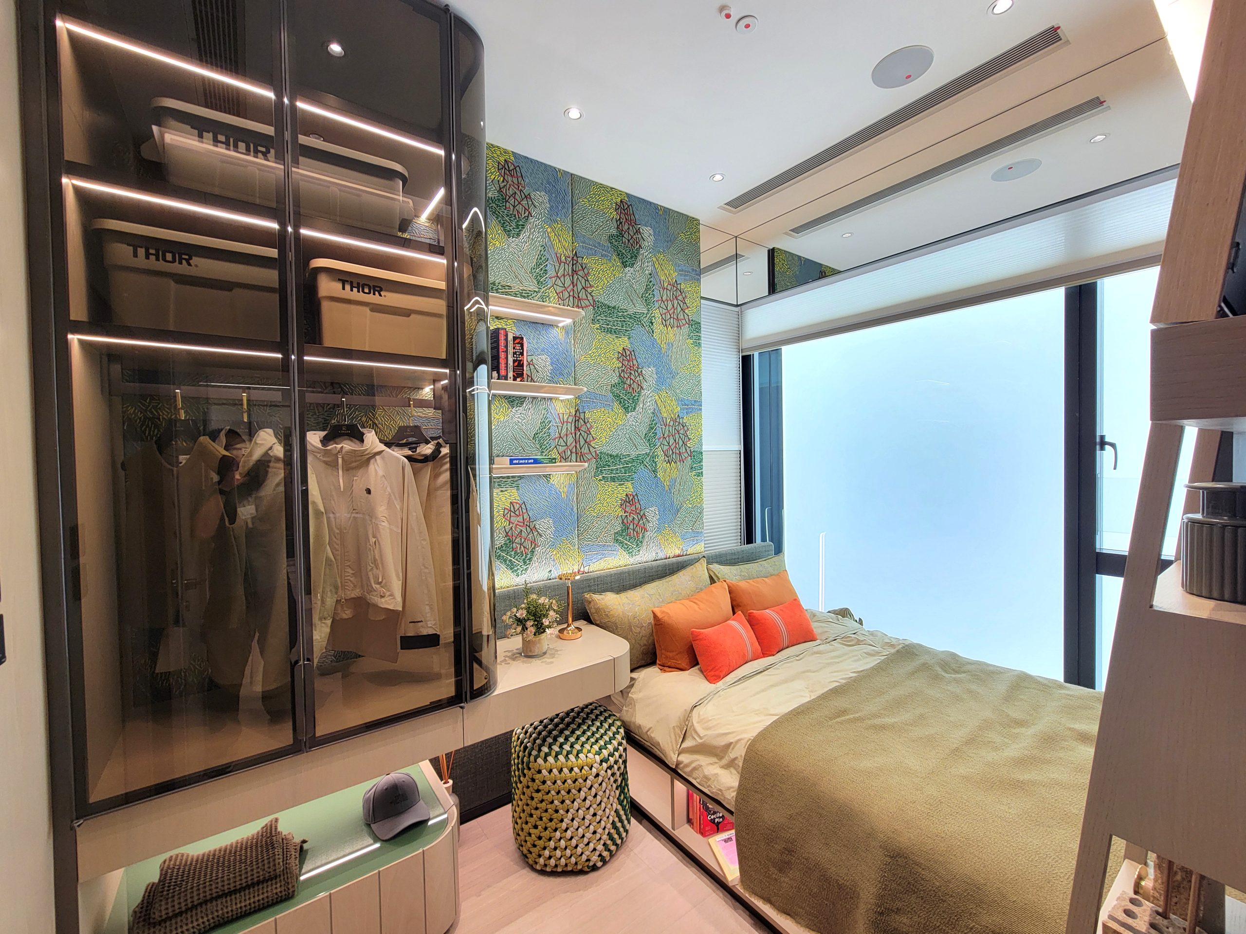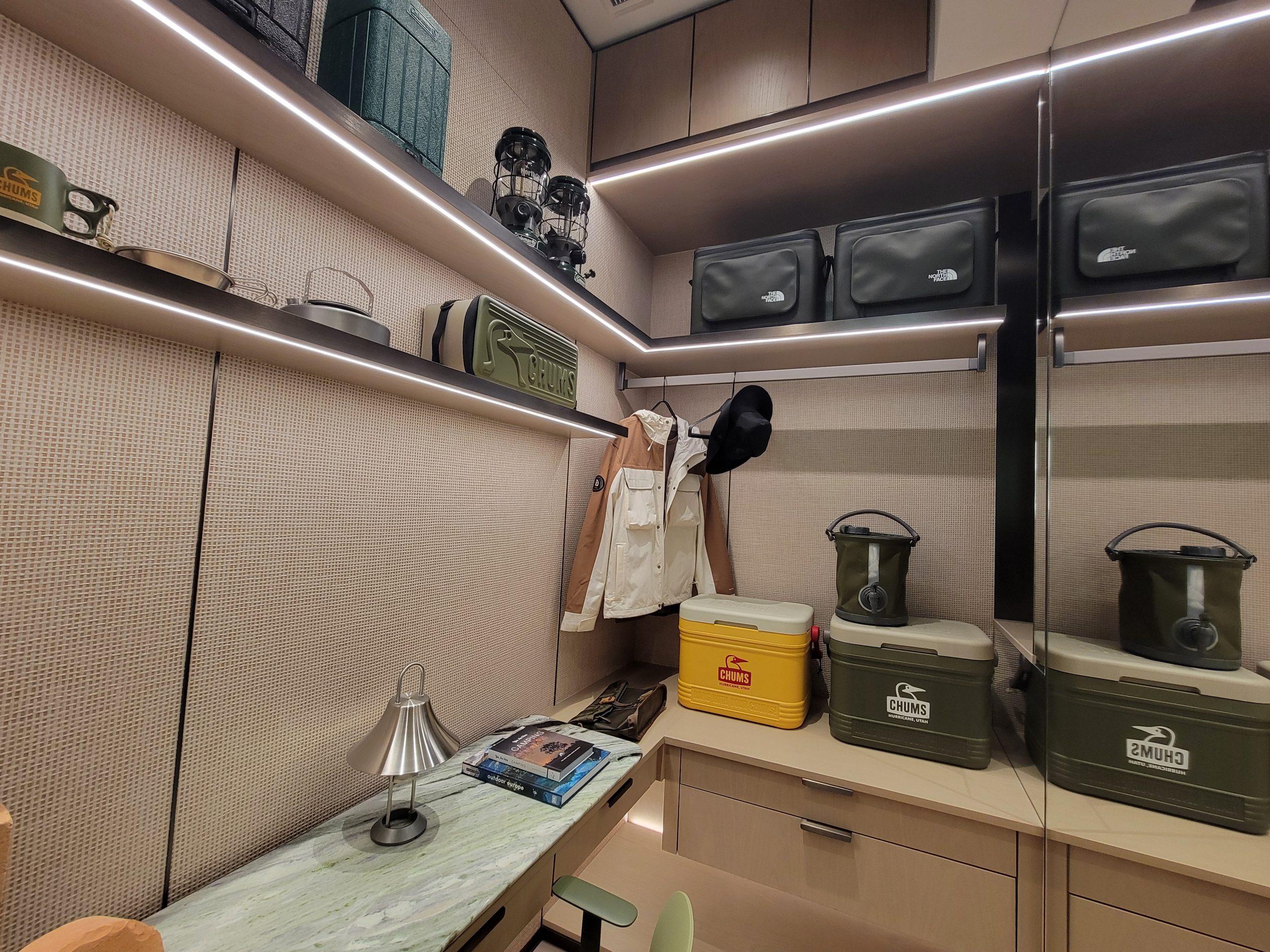 而多用途儲物室現作書房及放置用戶私人收藏之用,房間以綠色露營風為主調,層架上放置各式露營用品,並於每層層架下細心佈置長型電燈,為書房提供充足照明。淡綠仿雲石紋的書桌配橄欖綠工作椅,有格調而不失雅致。房內設有窗戶,氣氛悠閒舒適。其中一面牆嵌有落地鏡面,增强空間感。