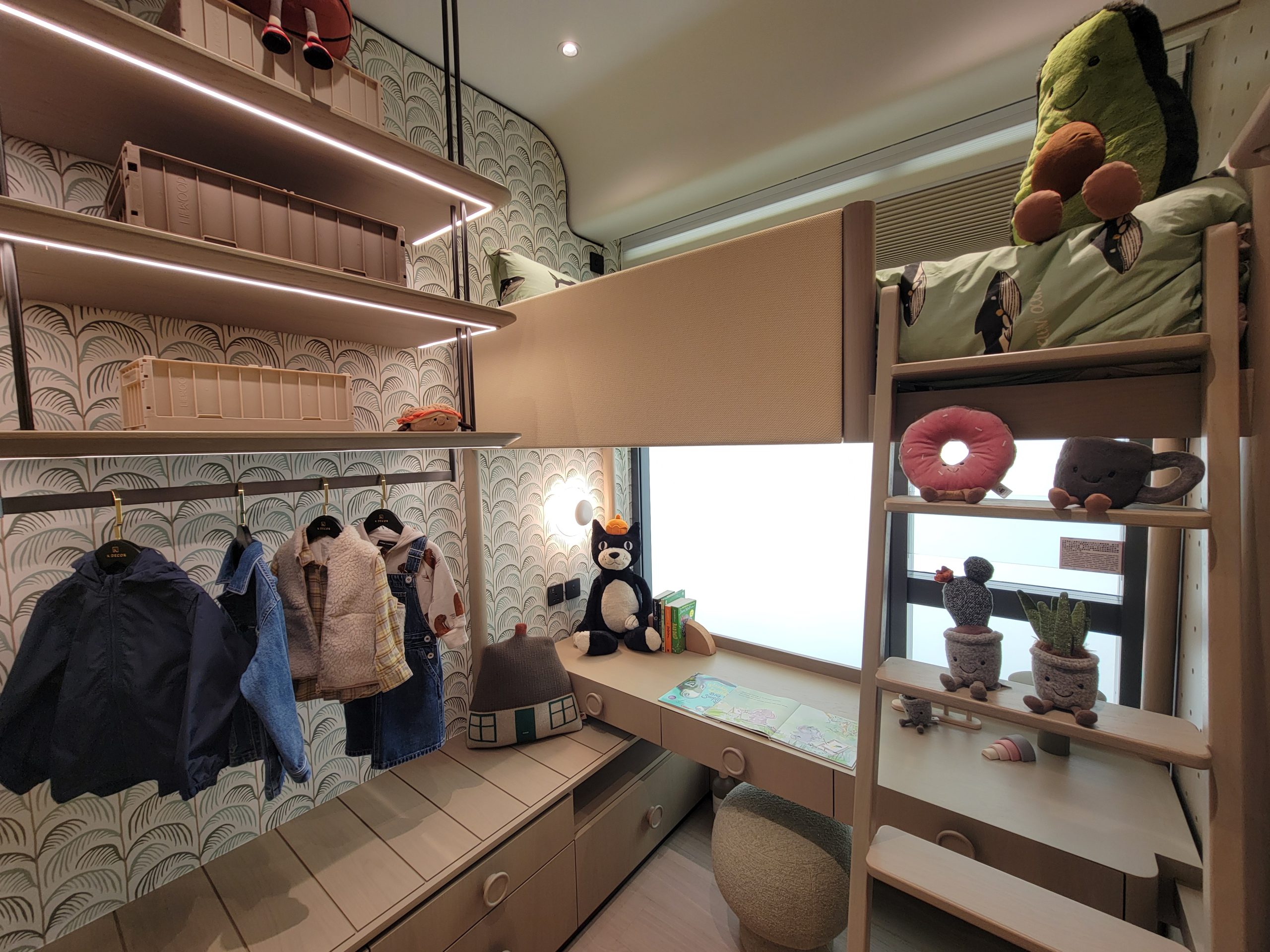 睡房2貫徹單位以原木色為主調,地面以複合木地板鋪砌,增添舒適溫暖感覺。書桌櫃兩用的平台,可收納大量個人物品及床鋪用品。近窗一端連接高架床,床架以淺木色為主色調牆上的洞洞板提供置物空間,亦可擺掛吊飾而不佔用書桌桌面,盡用每一寸空間。書櫃旁擺放淺木造型衣櫃,可供擺放衣物及各式各樣生活用品,為房間提供收納空間。