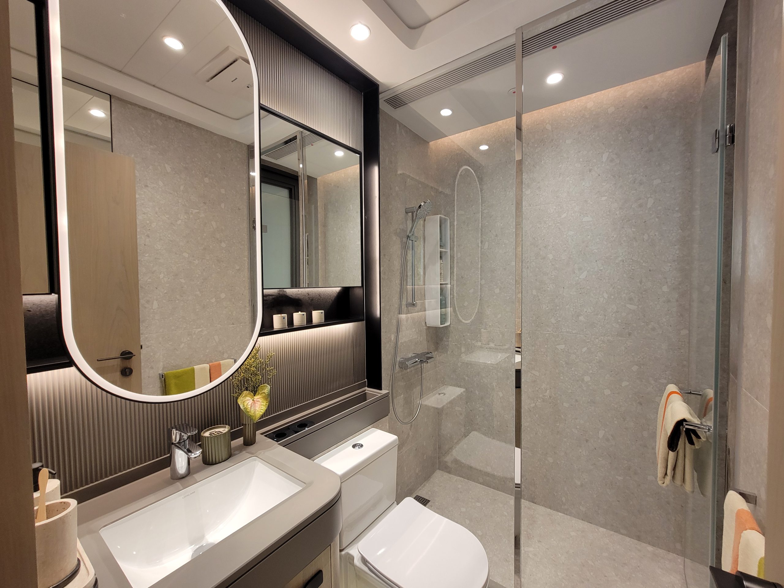 浴室1與主人浴室皆使用實心木門設計,節省空間且更靈活。地板採用色調淡雅的花灰色石紋地磚,延伸至牆身,設三件頭浴室配備,包括淋浴間、襯上白色洗手盆及坐廁。浴室設有特大鏡櫃,貼心實用,鏡櫃更內藏燈槽、電插座及吹風機收納位,照顧入微。洗手盆櫃內設有小物儲存空間,方便收納個人物品,住戶可井然有序地收納物品,維持空間的整潔。浴室則特設乾濕分離的淋浴間,更配備Panasonic浴室寶、StiebelEltron電熱水爐,完善的設備讓住戶盡情享受淋浴的舒暢。浴室1為有窗設計,主人浴室外更有一個多用途平台,可以作為綠化角落或晾曬衣物,亦延伸了浴室的空間。