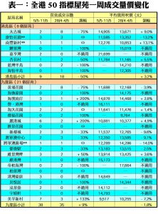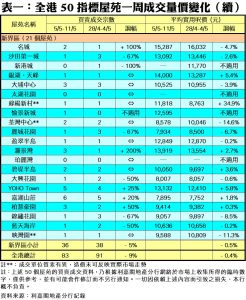 至於,九龍區21個指標屋苑上周共錄38宗交投,較前周的35宗增加9%,當中海濱南岸及麗港城分別錄得3宗及6宗買賣,按周各自增加2倍;美孚新村期內連錄7宗成交,較前周的3宗增加1.33倍;維景灣畔交投量由前周的2宗,增加50%至上周的3宗。此外,在全港50個指標屋苑之中,上周共有12個屋苑錄得「零成交」,較前周的11個增加9%,當中港島區及新界區分別佔3個屋苑,九龍區則佔6個(詳見表一)。