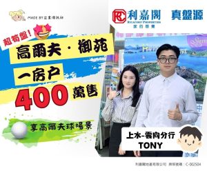 利嘉閣地產上水區高級區域董事何鑫(Ken­ny)稱,上水-雲向分行高級客戶經理王世通(Tony)最新促成上水高爾夫.御苑7座高層C室的二手成交個案,單位實用面積約375方呎,屬1房連開放式廚房間隔,向南,外望高爾夫球場景。
