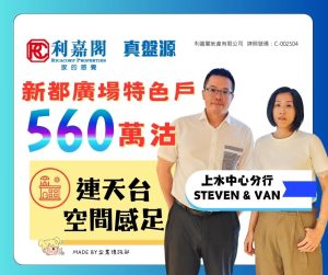 利嘉閣地產上水中心分行首席聯席董事黃靜顏(Yen)表示,該行客戶董事廖嘉姿(Van)及高級物業顧問夏英傑(Steven)共同促成上水新都廣場1座一個頂層連天台特色戶的二手成交個案,單位實用面積約484方呎,連454方呎天台,屬2房間隔,向東南,外望開揚景觀。